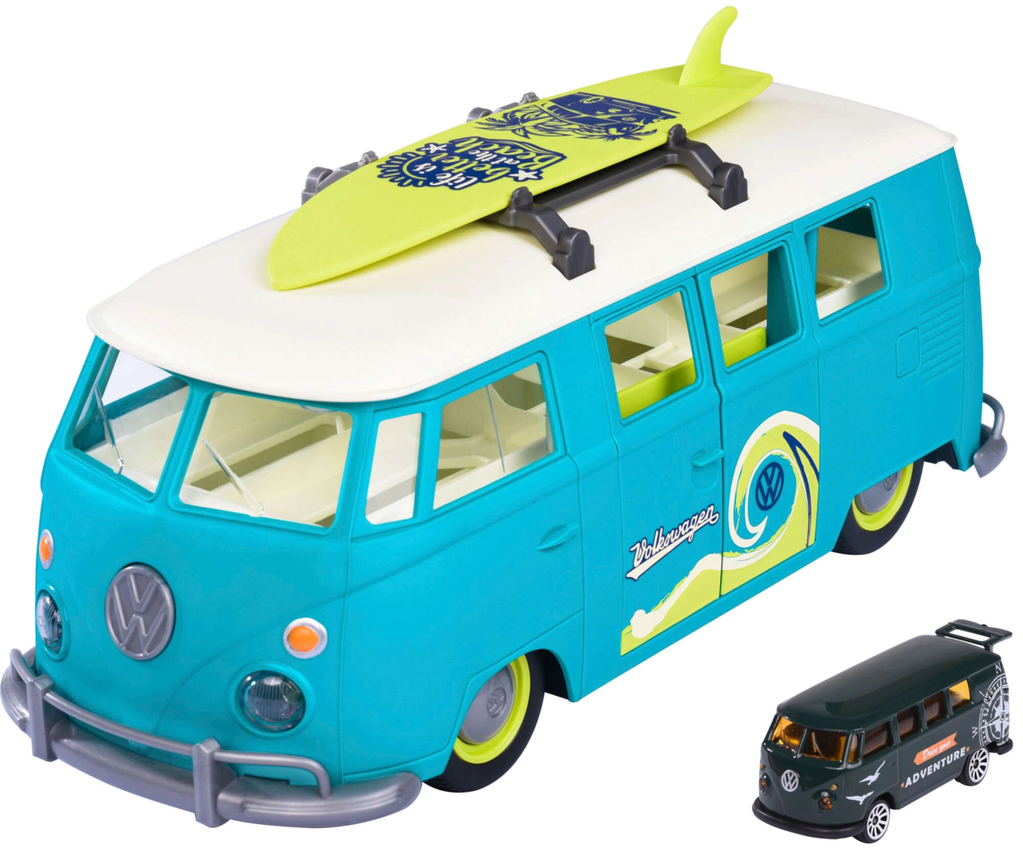 Abnehmbares Surfbrett auf dem Dachträger und liebevolle Karosseriedetails im Retro-T1-Stil begeistern kleine Surfer und Sammler.