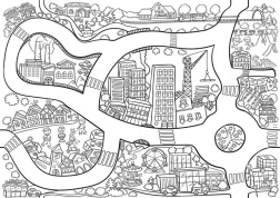 Colorieren Sie gemeinsam mit den Kindern an dem großen Format, das sich leicht auf Tisch oder Boden ausbreiten lässt. Wenn Sie alle sechs Motive sammeln, können Sie sie zu einer großen Karte verbinden, die durch eine Straße zusammengeführt wird – perfekt als Dekoration fürs Kinderzimmer.
