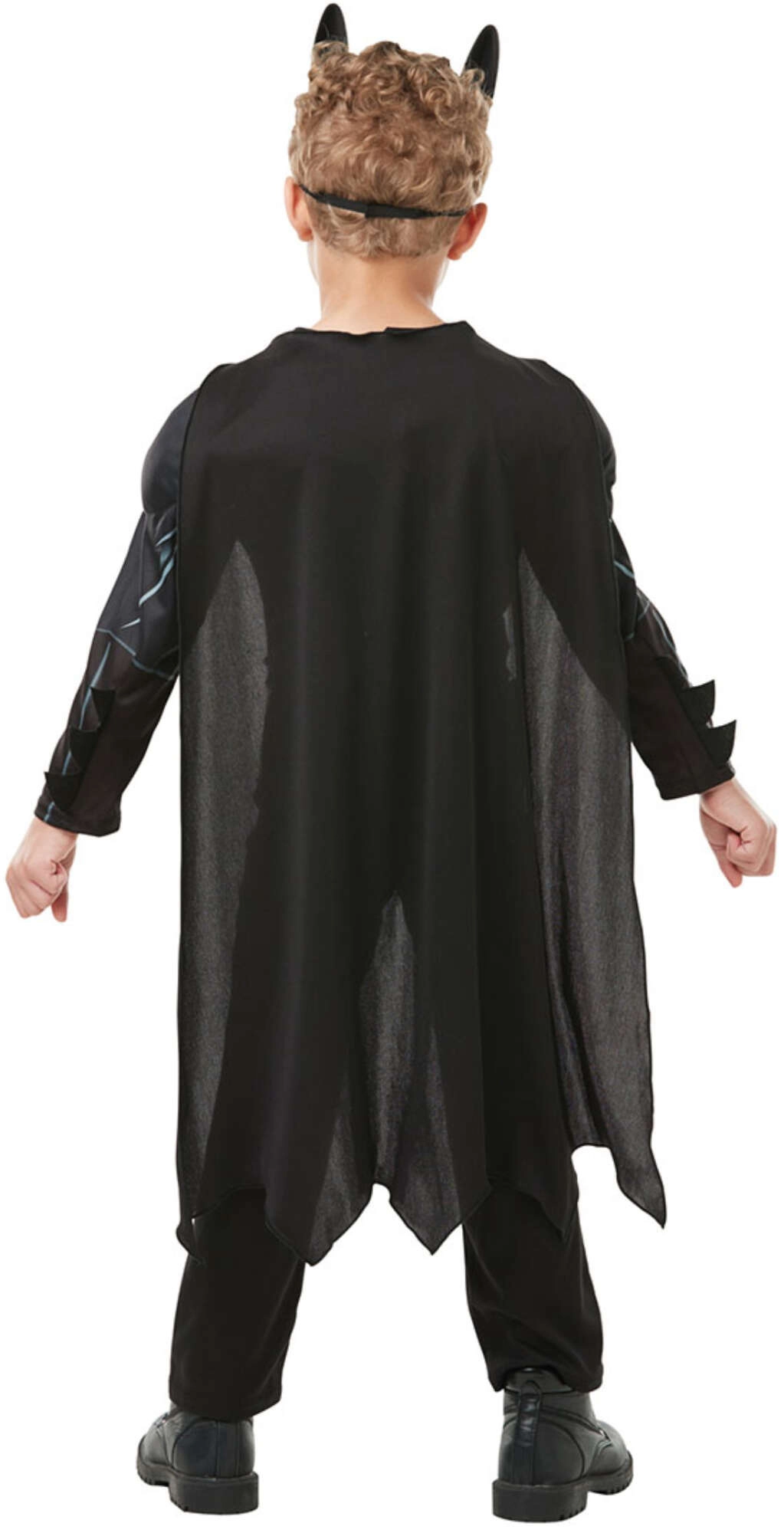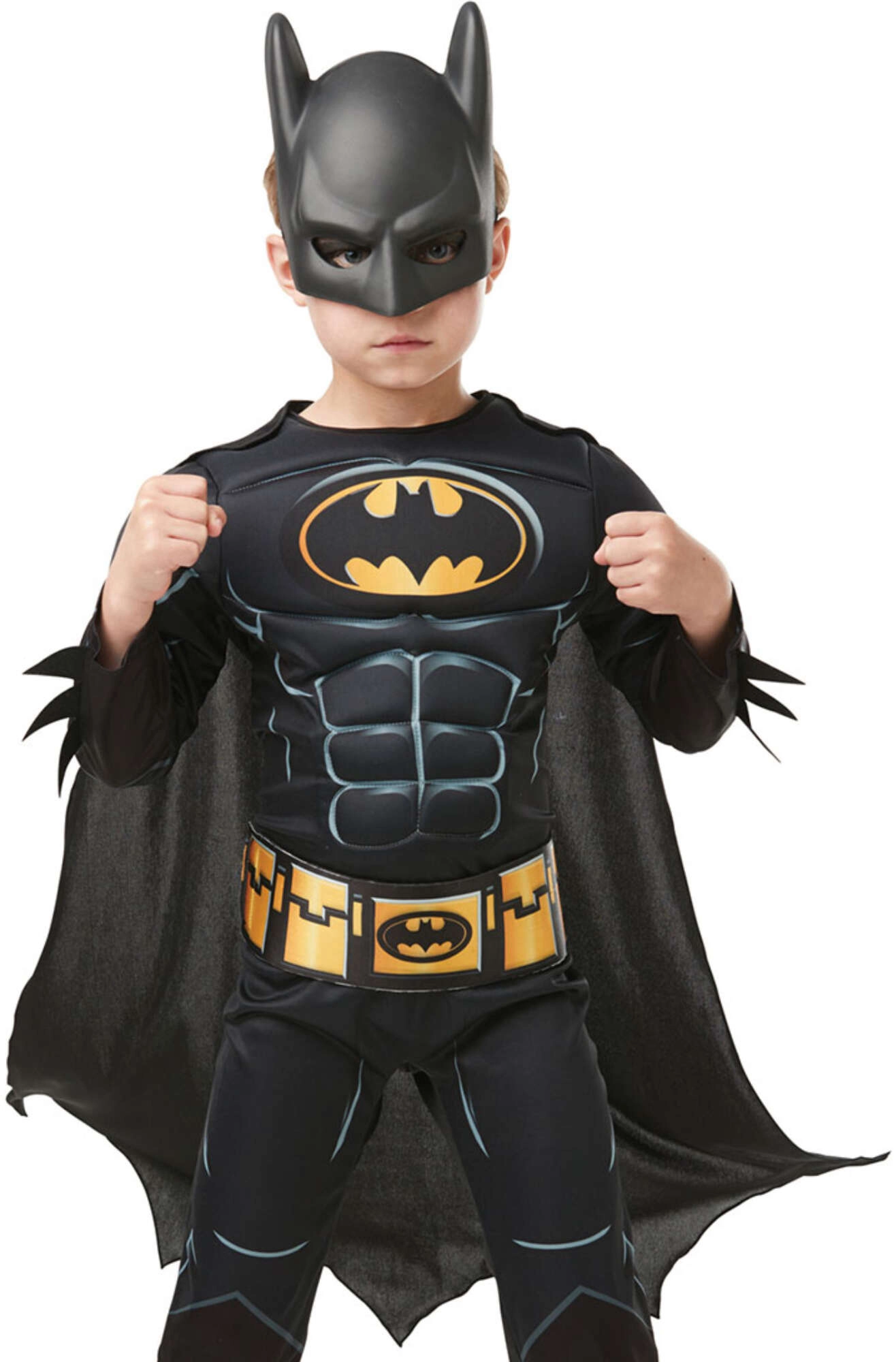 Das offiziell lizenzierte DC COMICS BATMAN-Kostüm verwandelt Ihr Kind in den furchtlosen Beschützer der Stadt. Leichtes, bequemes Material mit auffälligem Muskelpanzer-Druck, gelbem Utility-„Gürtel“ und befestigtem Umhang bietet eine eindrucksvolle Optik und Komfort in der Bewegung.