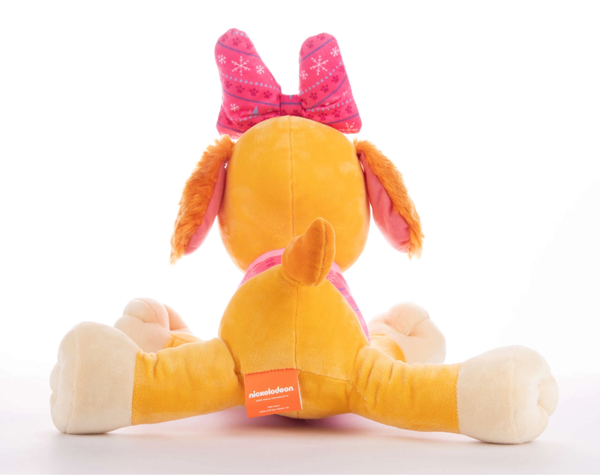 Dieses große SKYE Plüschtier in Bauchlage ist wie geschaffen zum Kuscheln und Spielen. Sie hat einen fröhlichen Ausdruck mit großen rosa Augen, eine niedliche Schleife am Kopf und trägt einen rosa Pullover mit Schneeflocken- und Tannenmotiven. Dank gestickter Augen und Nase ist sie auch für jüngere Kinder sicher.