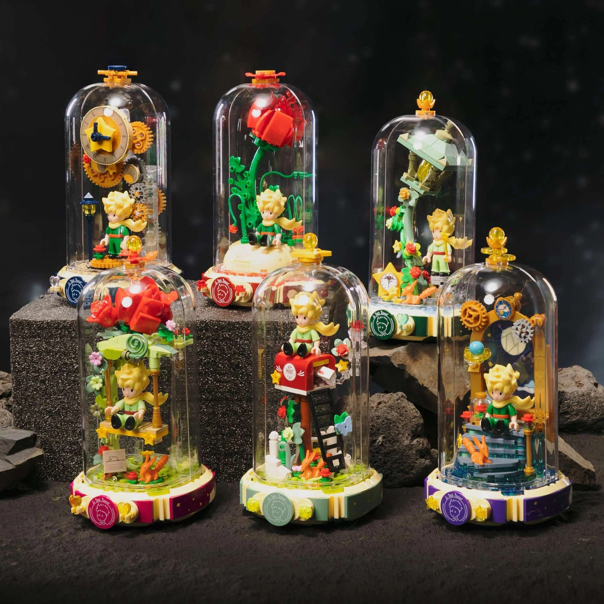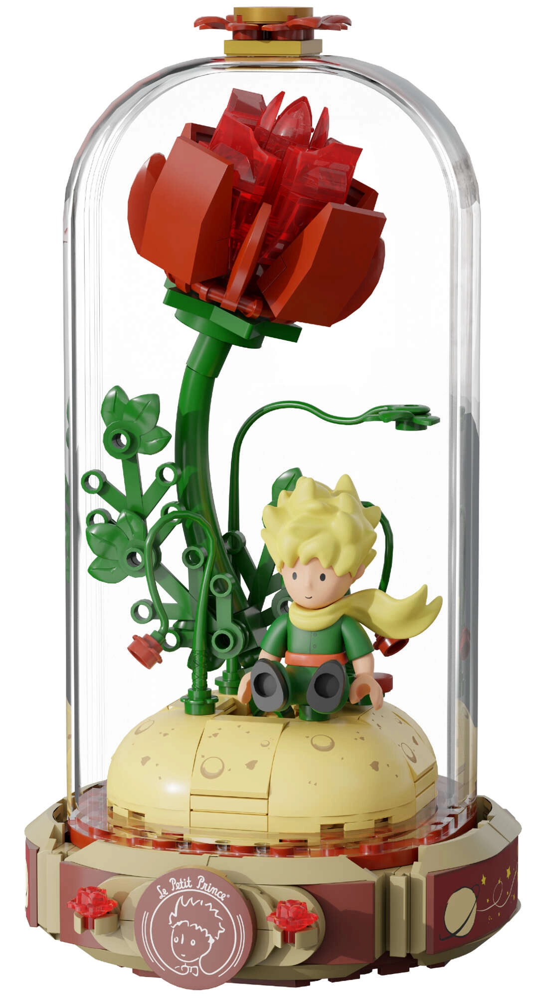 Bauen Sie die symbolische rote Rose auf einem Sockel in Form eines geöffneten Buches mit der Aufschrift „Le Petit Prince“. Daneben stehen der kleine Prinz und der Fuchs in ihrer typischen Pose. Fein abgestimmte Details von Stielen, Blättern und Blüten verleihen dem Modell Harmonie und Eleganz – ein großartiges Stück für die Vitrine und kreativen Spielspaß.