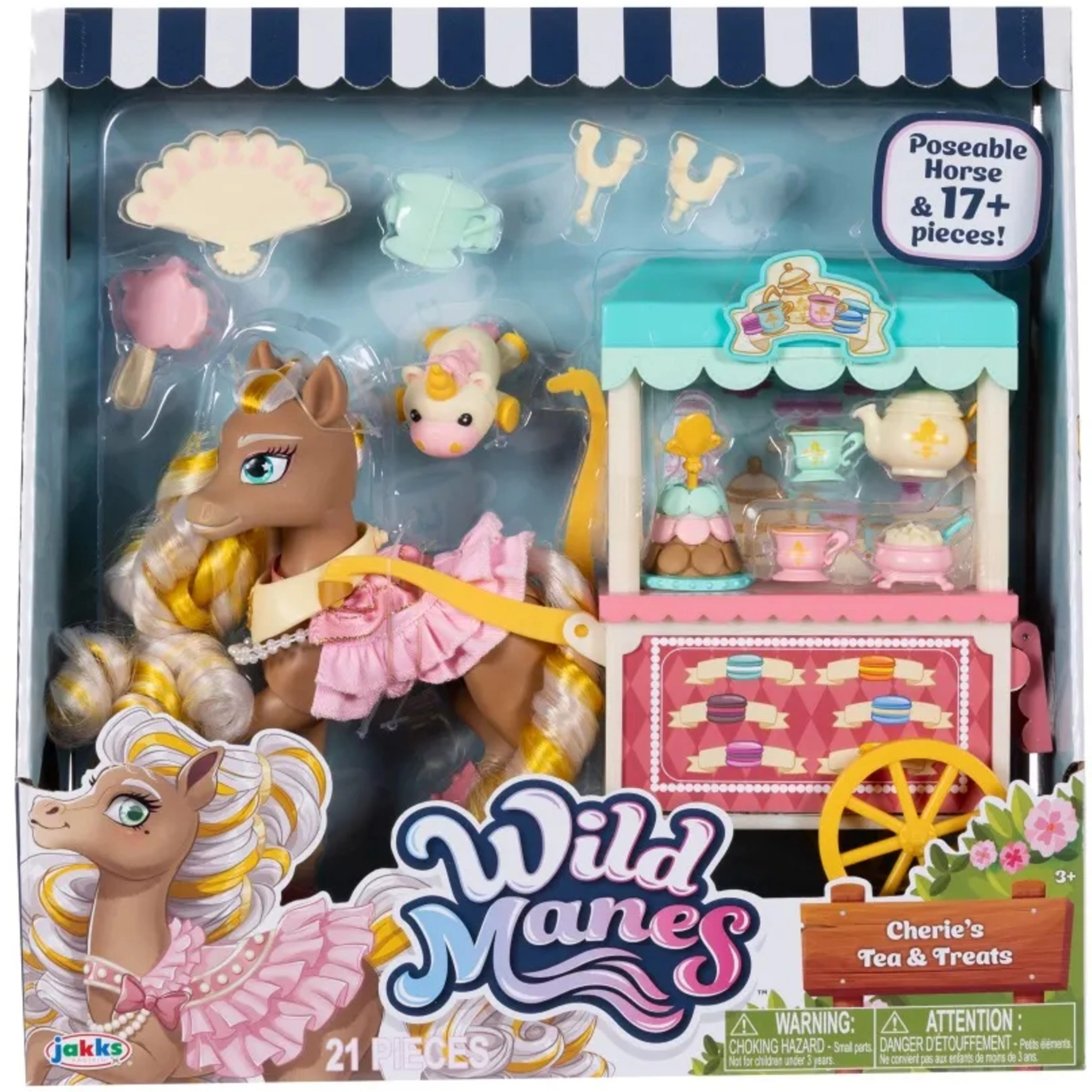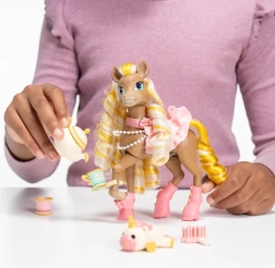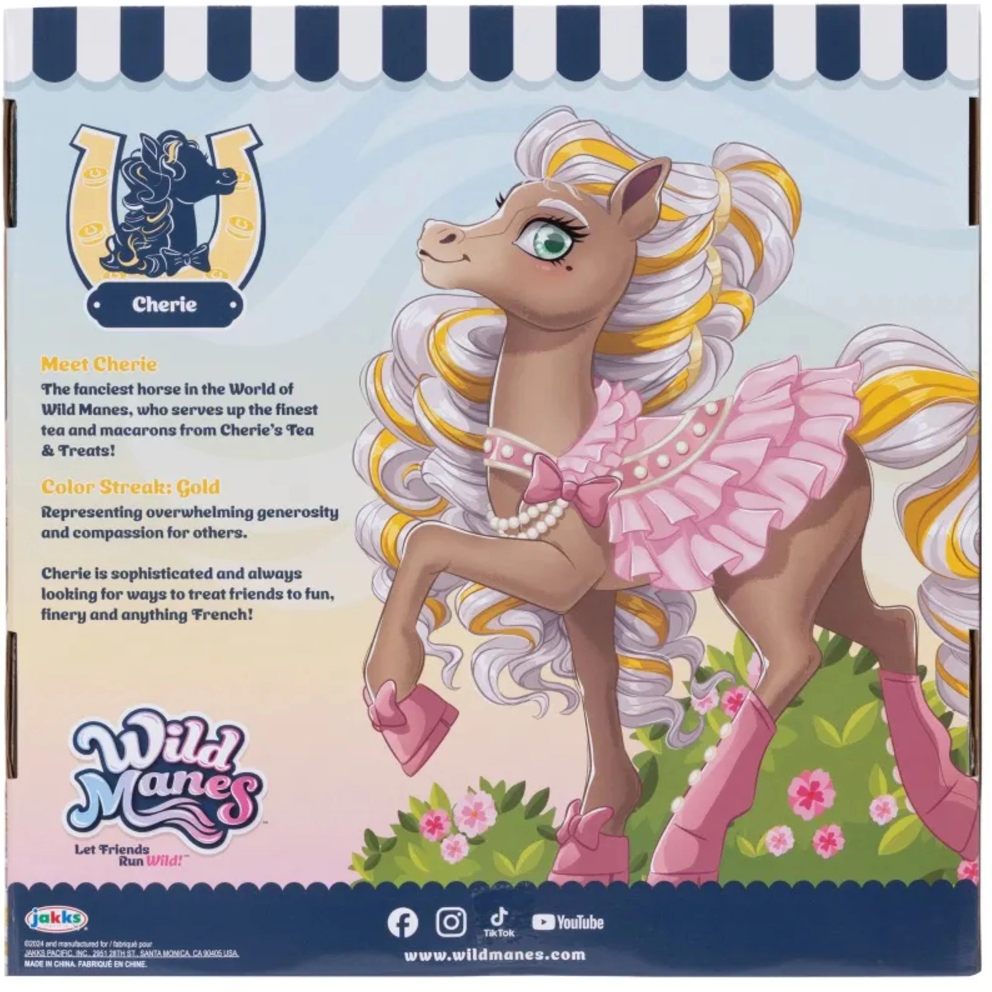 Die Figur Cherie im rosa Röckchen und mit Schuhen ist bereit für eine Teeparty. Dank der beweglichen Beine lässt sie sich leicht in verschiedene Posen bringen, um Lieblingsszenen aus der Welt von WILD MANES nachzustellen. Die lange, wellige Mähne und der Schweif mit goldenen Streifen laden zum Kämmen und Stylen ein.