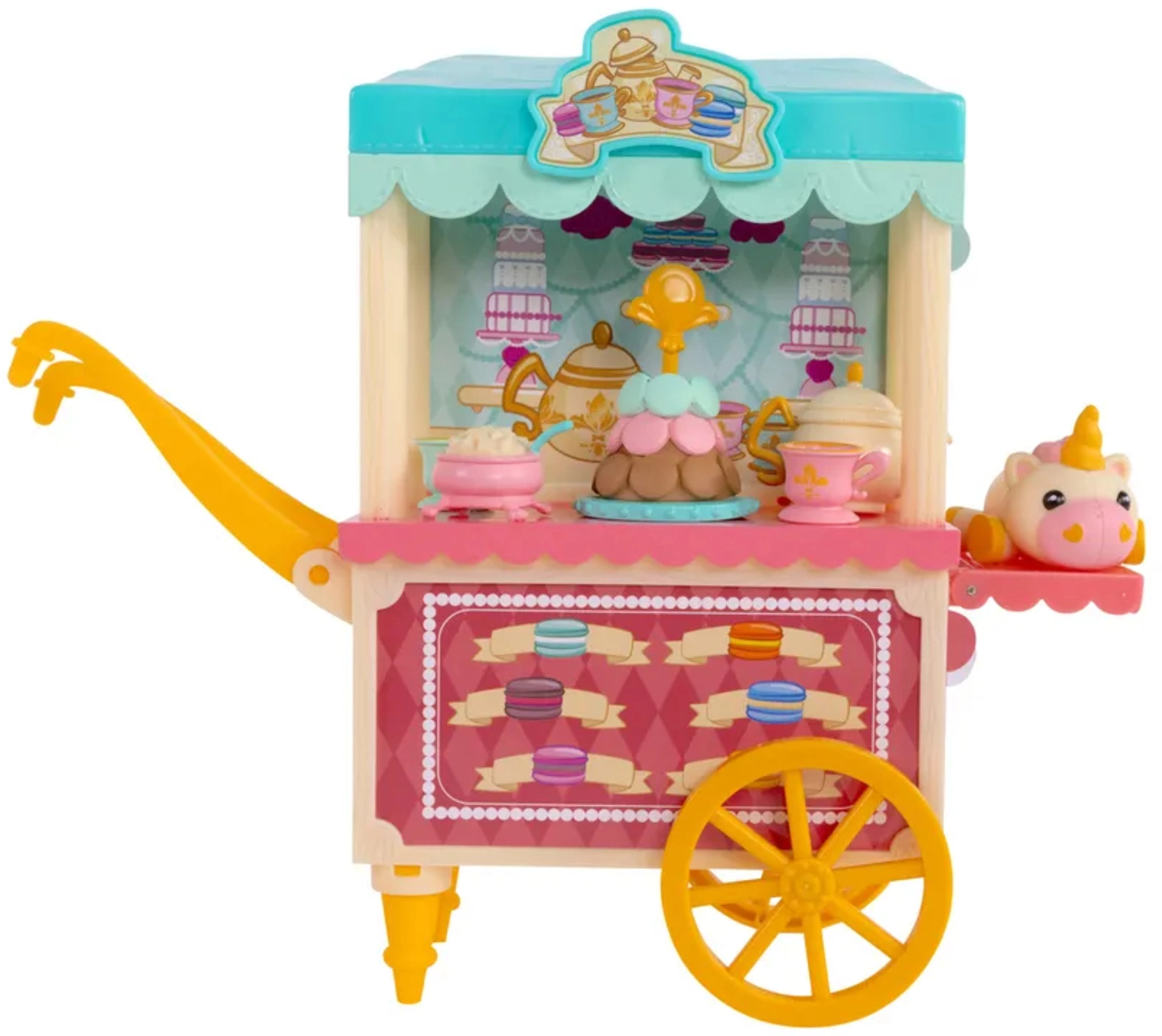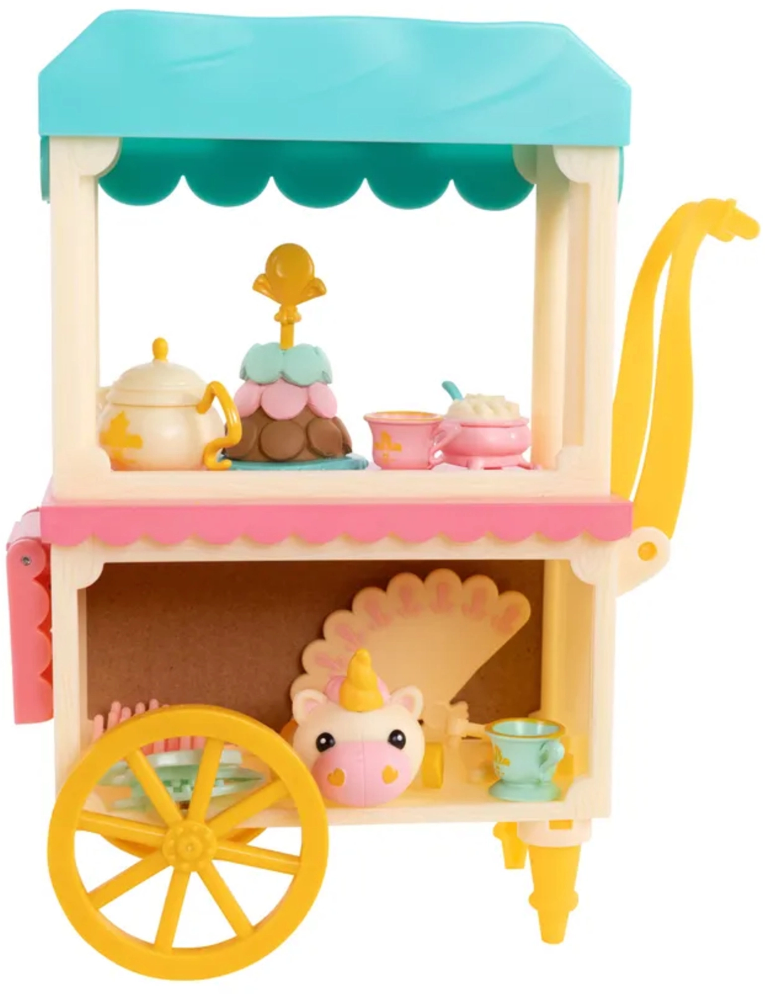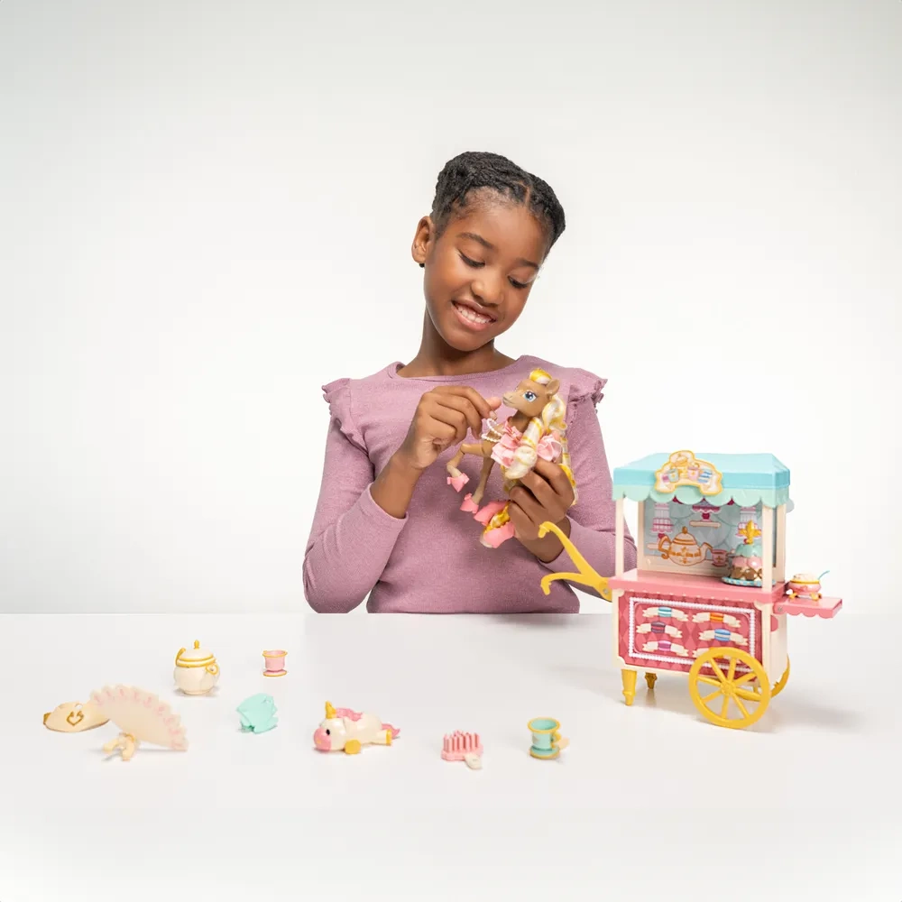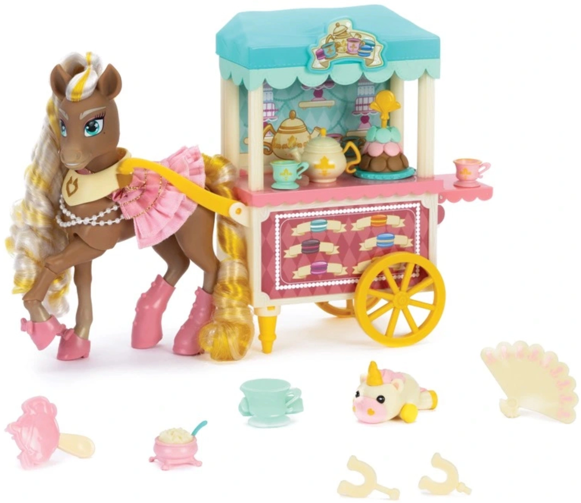 Dabei ist der große Tea-&-Treats-Wagen mit zwei rollenden Rädern, einer Teekanne, Tassen, Macarons auf einem Ständer und weiteren niedlichen Details. Der Wagen kann mithilfe der Deichsel am Pony befestigt werden – und schon geht’s los. Dank der Hufeisen-Clips kann Cherie Zubehör fest halten.