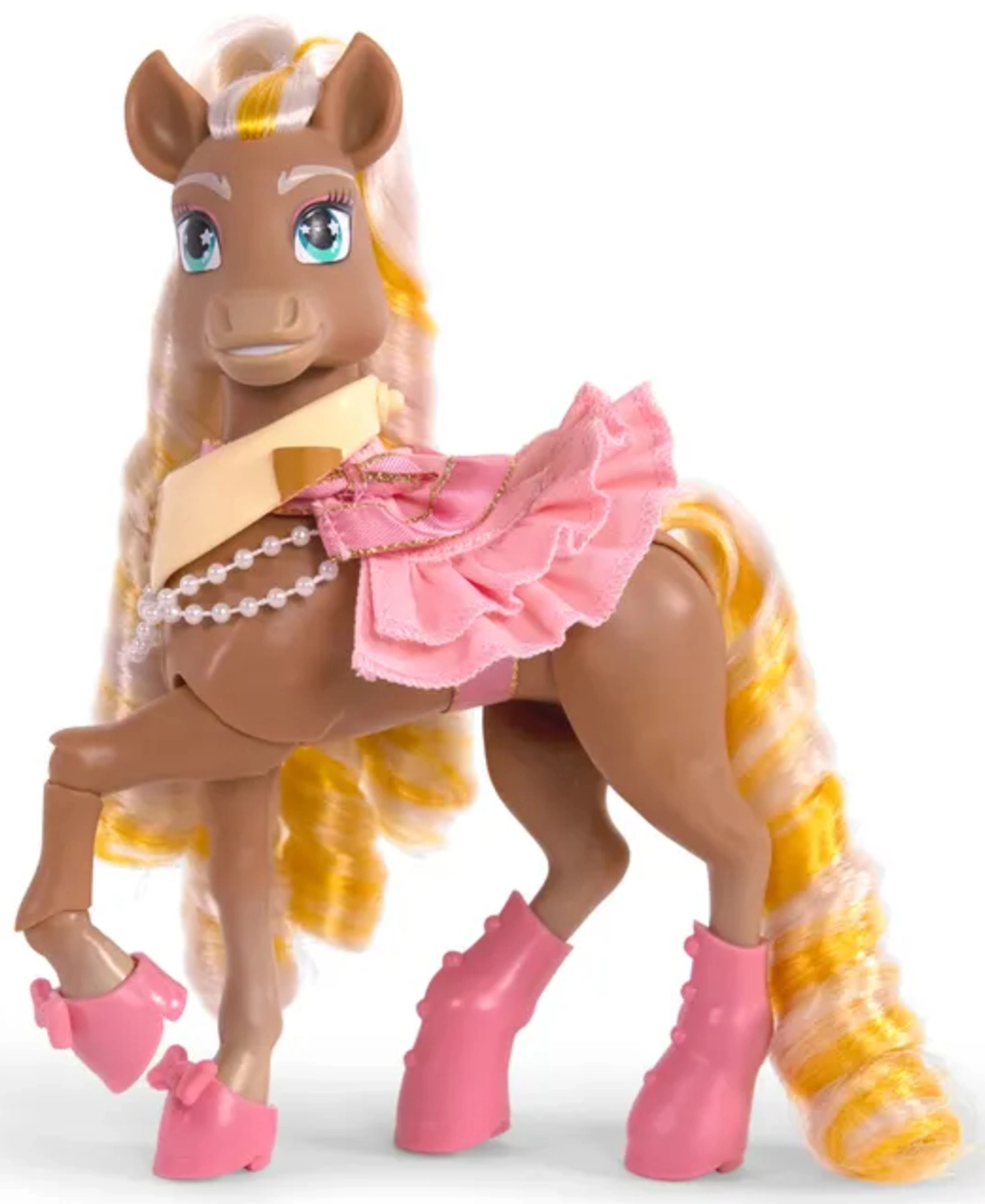 Pony mit beweglichen Gliedmaßen, langer Mähne mit goldenen Strähnen und der Möglichkeit, dank Hufeisen-Clips Zubehör zu halten.