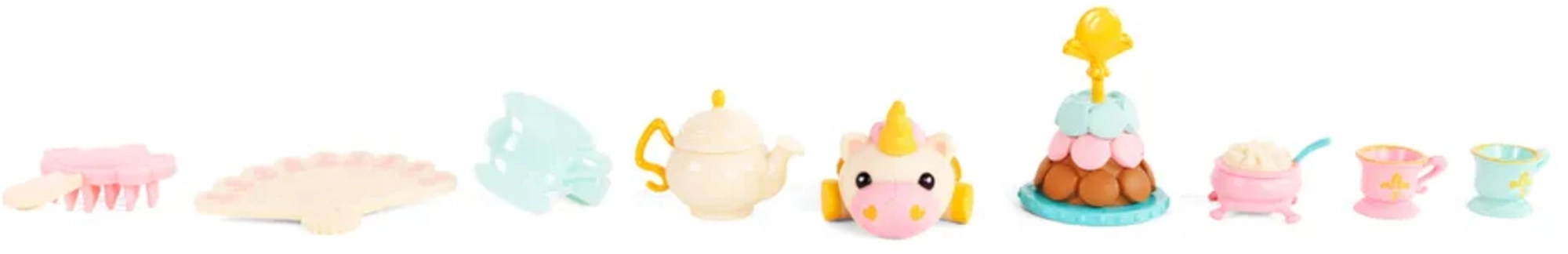 Im Set enthalten sind ein Teeservice, Desserts, ein Kamm, ein kleines Einhorn und weitere Kleinigkeiten für vielfältige Szenen.