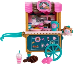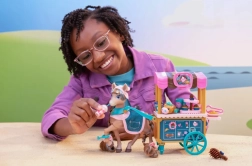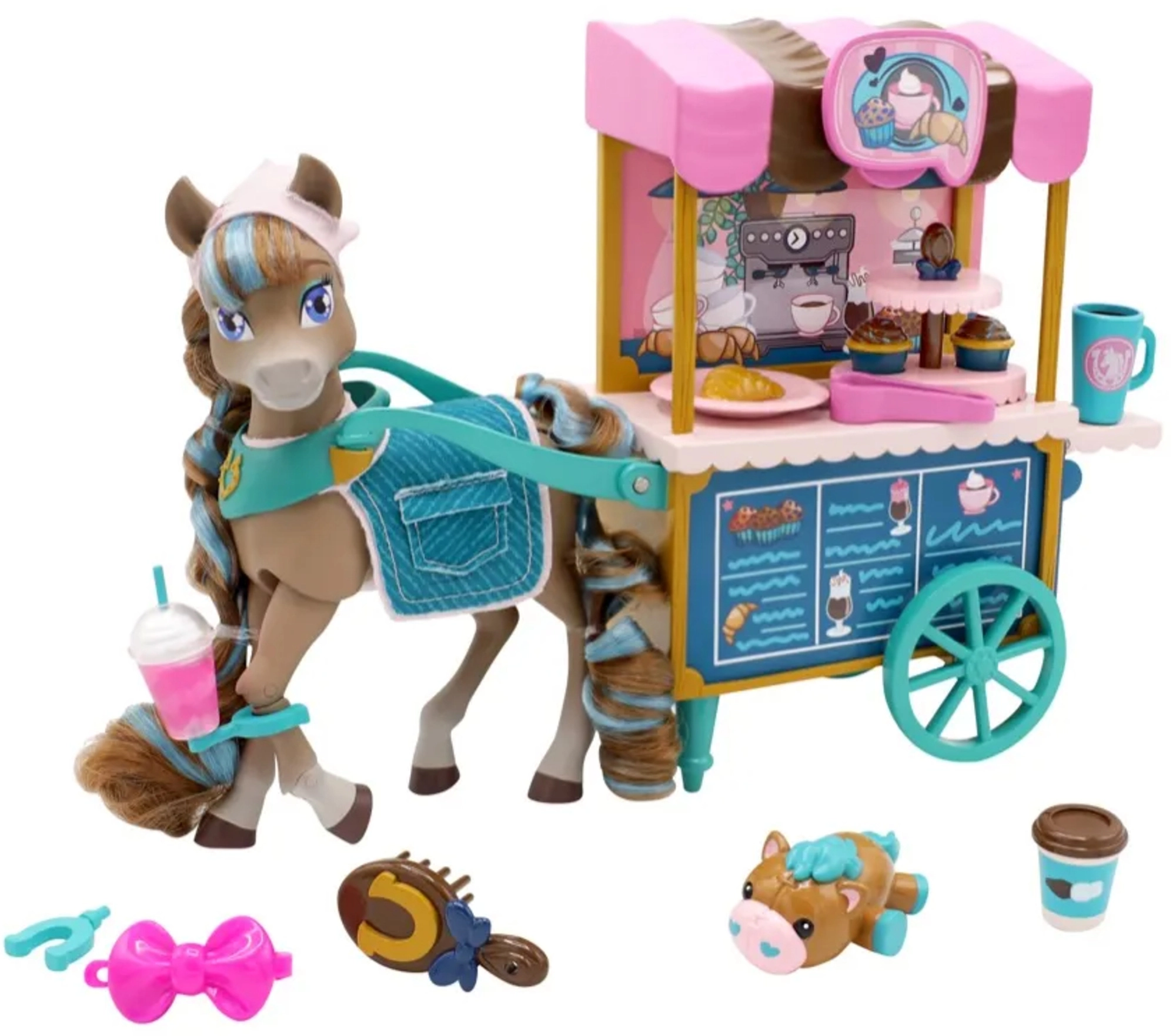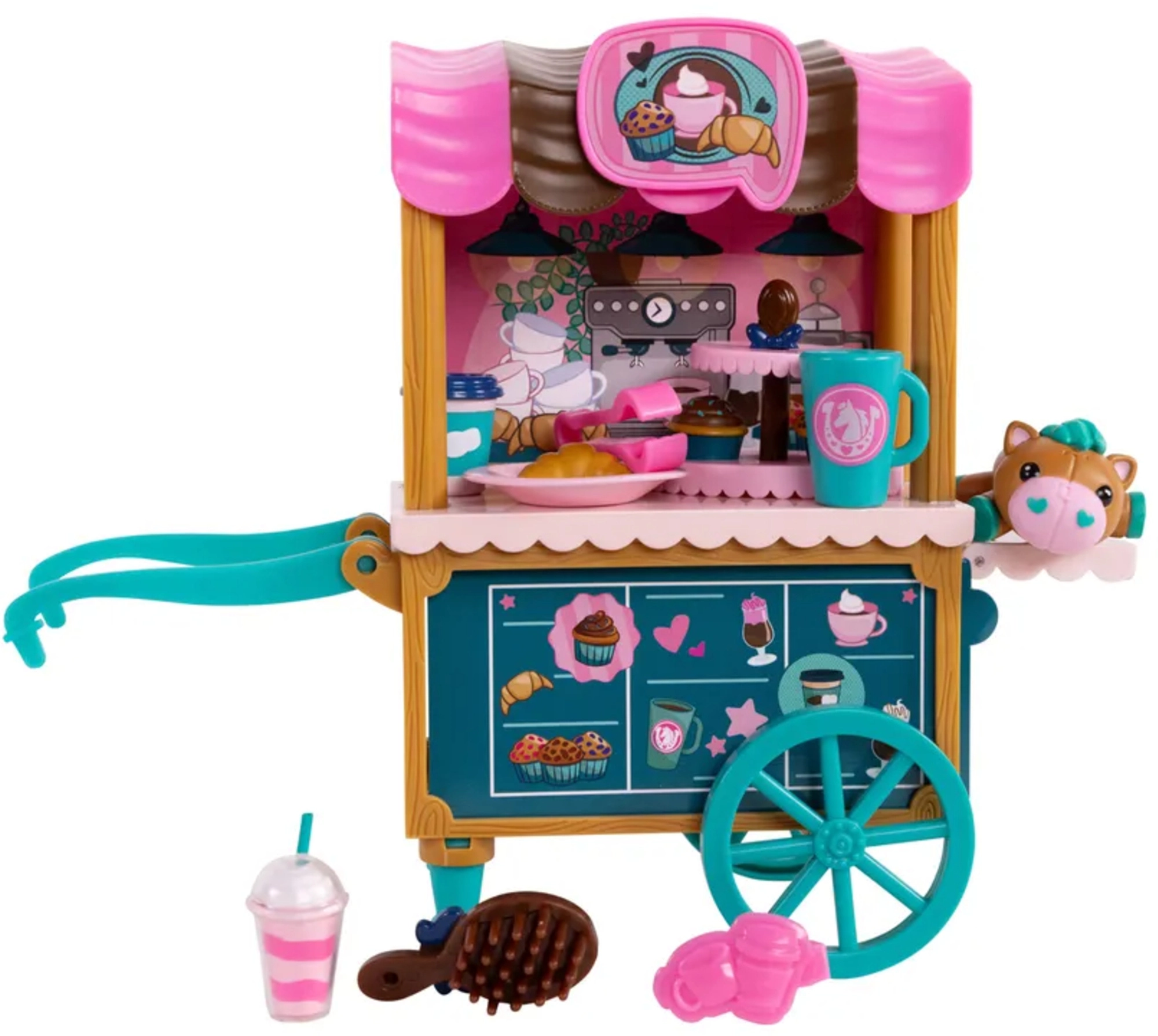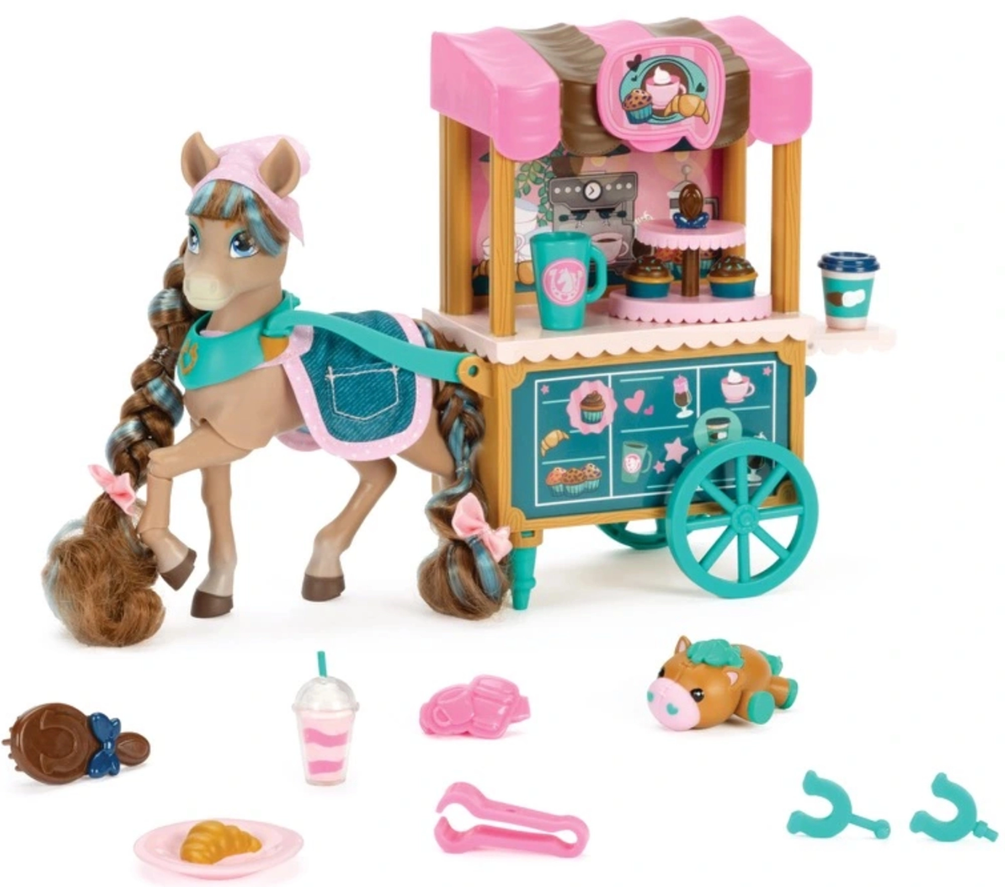 Der Wagen verfügt über drehbare Räder, einen Griff und Ablagen für Leckereien, ein farbiges Dach und Café‑Grafiken. Das Set umfasst außerdem Servier- und Backzubehör, ein kleines Haustier und eine Bürste zum Stylen der Mähne. Alles ist auf kreatives Rollenspiel, die Förderung der Feinmotorik und soziale Interaktion ausgelegt.