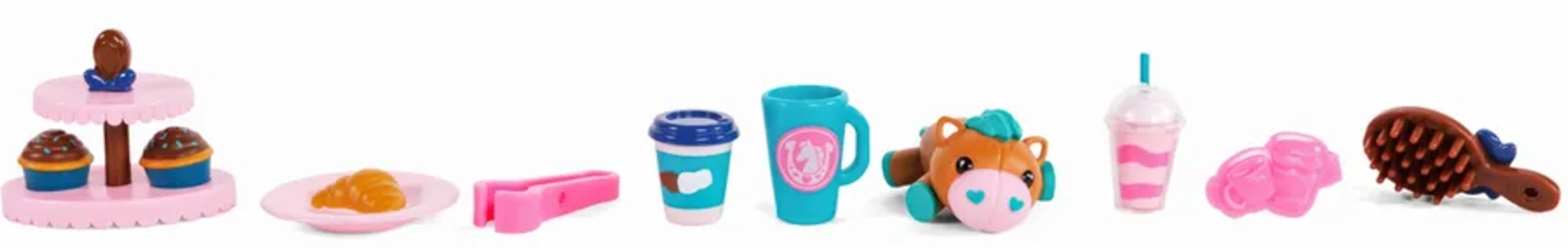 Im Set enthalten sind Gebäck, Getränke, eine Bürste, ein Cupcake‑Ständer und ein niedliches Haustier – alles für stundenlangen Spielspaß und Pony-Pflege.