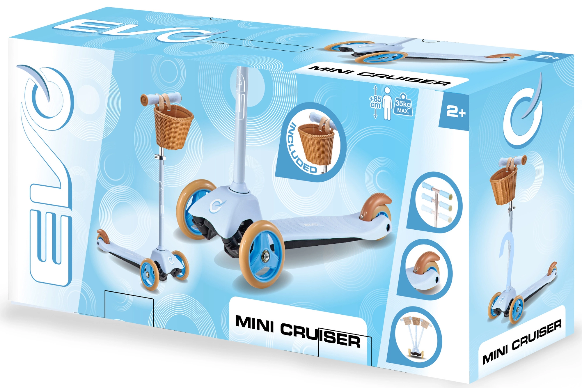 Der EVO Mini Cruiser ist ein Balance-Dreiradroller, der für die ersten Fahrten sowie die Entwicklung von Gleichgewicht und sicherer Lenkung konzipiert ist. Die niedrige und breite, rutschfeste Trittfläche, zwei größere Vorderräder und ABEC-5-Lager sorgen für eine ruhige und leise Freizeitfahrt auf ebenen Untergründen. Der abnehmbare Korb ermöglicht es Kindern, Kleinigkeiten oder ein Lieblingsspielzeug auf Ausflüge mitzunehmen.