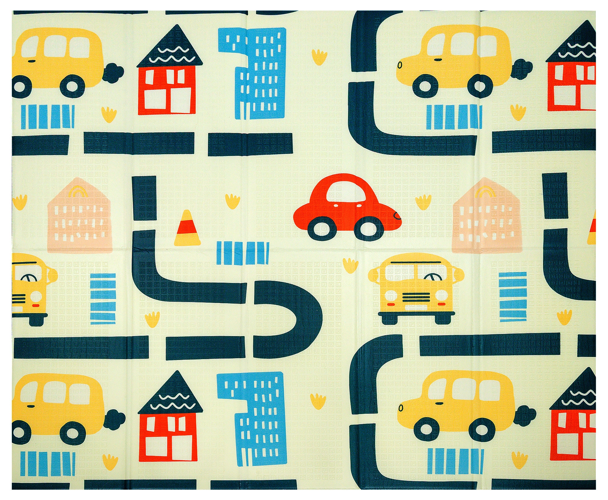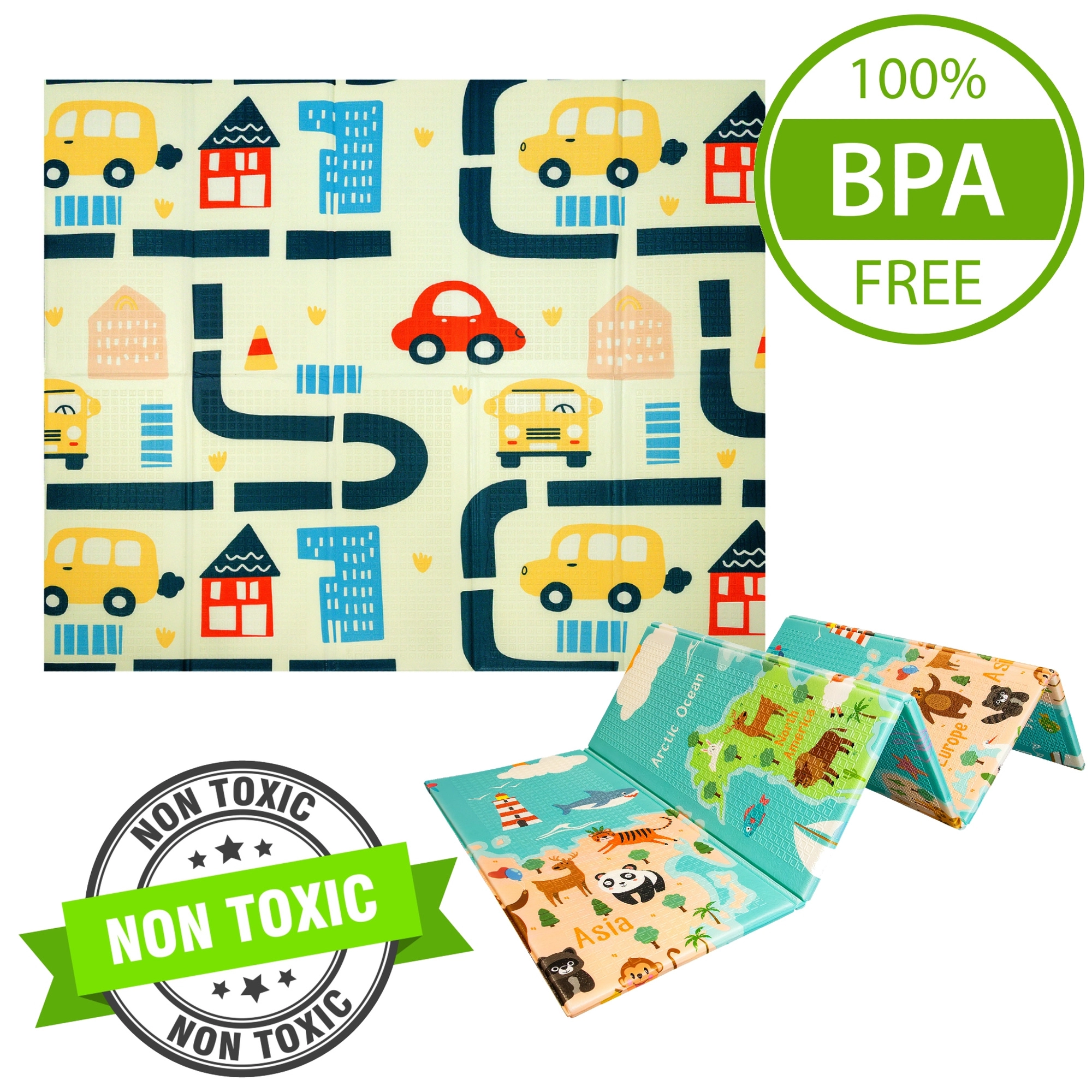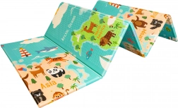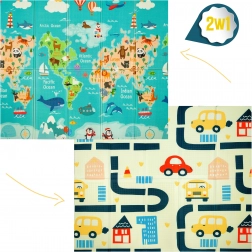 Eine Seite mit bunter Weltkarte und Tieren, die andere mit Stadt, Straßen und kleinen Autos. Zwei edukative Themen in einer Matte fördern Fantasie und Wissen.