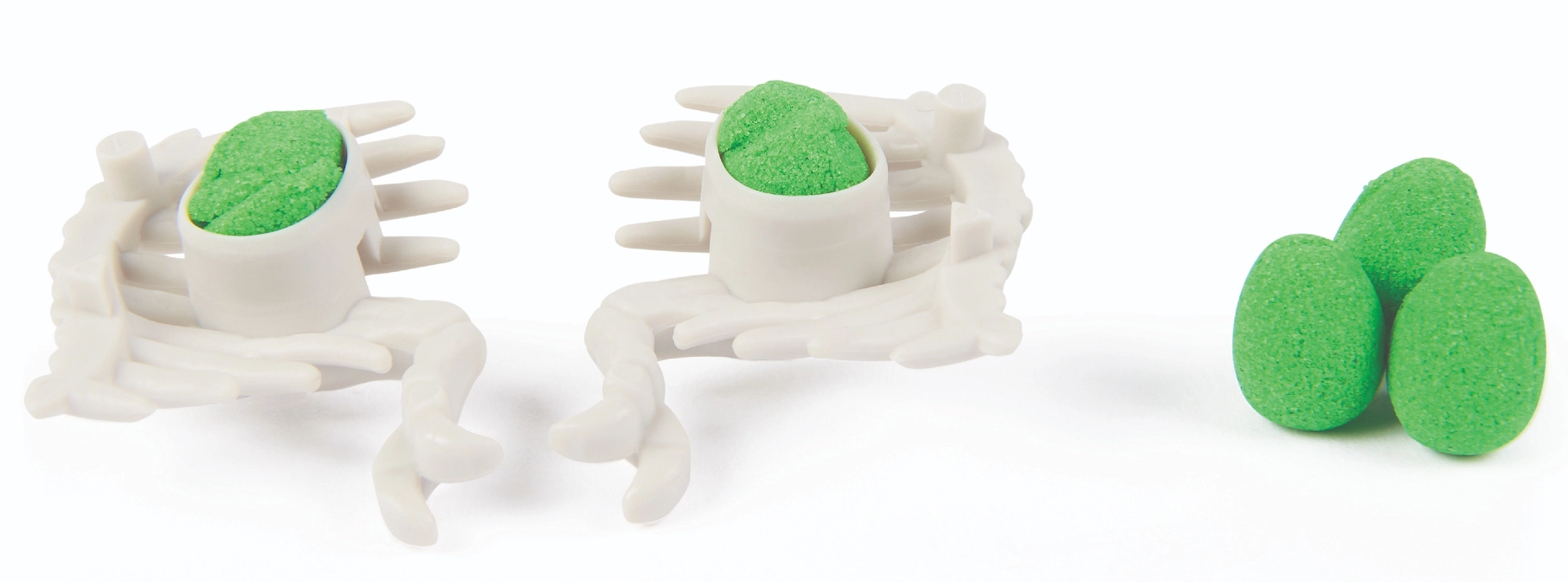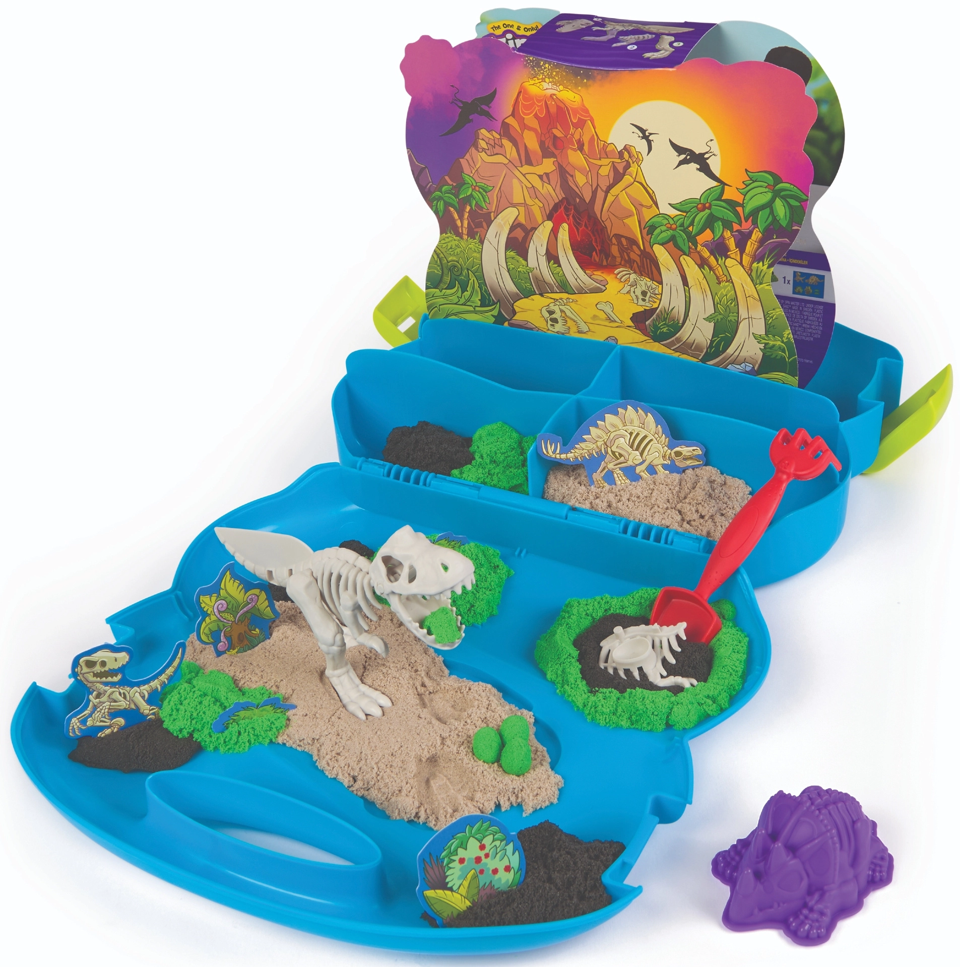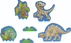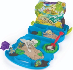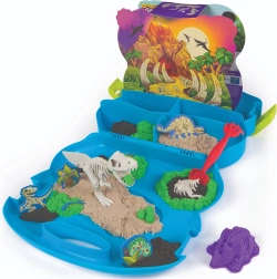 Das Set fördert Feinmotorik, Vorstellungskraft und sensorische Wahrnehmung. Im Set enthalten sind umfangreiches Zubehör: ein Kunststoffskelett, Formen, ein Grabwerkzeug, Kartonfiguren von Pflanzen und Dinosauriern sowie eine farbige Kulisse zum Aufbau einer Mini-Dinosaurierwelt.