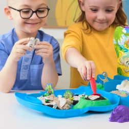 Dieses kreative Set mit kinetischem Sand bietet Kindern ein realistisches Erlebnis von T‑Rex-Fossilien-Ausgrabungen. Dank der unterteilten Tablett-Wanne haben Kinder alles übersichtlich zur Hand, können Sandfarben mischen, die Landschaft formen und das Dino-Skelett als Abdruck oder Form zusammensetzen. Der Sand fühlt sich angenehm an, hält die Form und hinterlässt keine Unordnung.