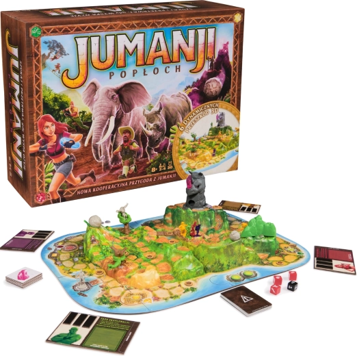 Ein wütender Elefant, ein springender Pavian, ein rollender Felsblock oder Raubtiere auf den Pfaden – jedes Element bringt Spannung und Abwechslung ins Spiel. Bunte Figuren und Marker verstärken die Jumanji-Atmosphäre.
