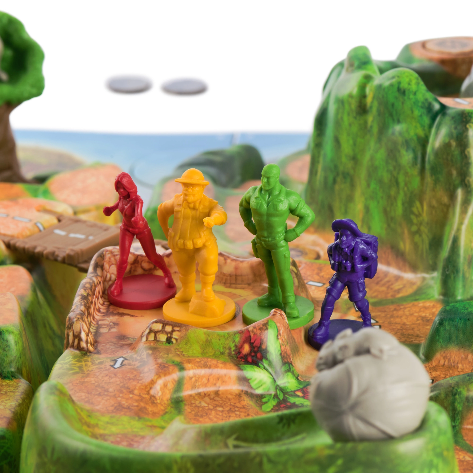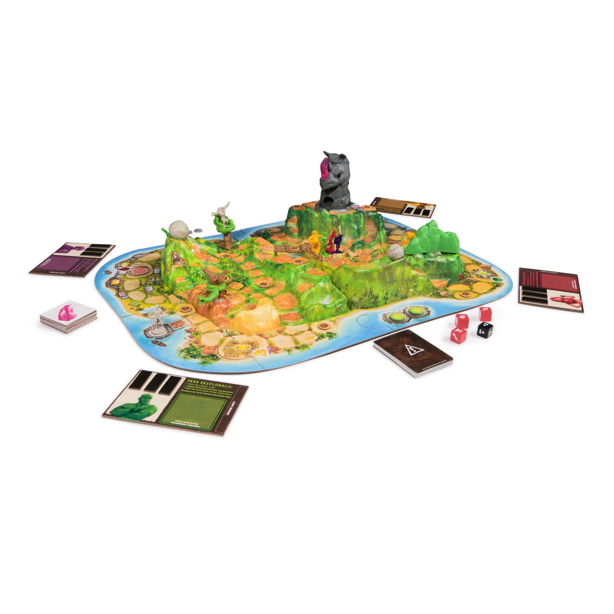 Das Highlight des Spielplans ist der markante 3D-Nashornberg mit einem Kristallhorn. Erhöhtes Gelände, Brücken und Wege schaffen ein fesselndes Abenteuer und einen klar geführten Spielablauf.
