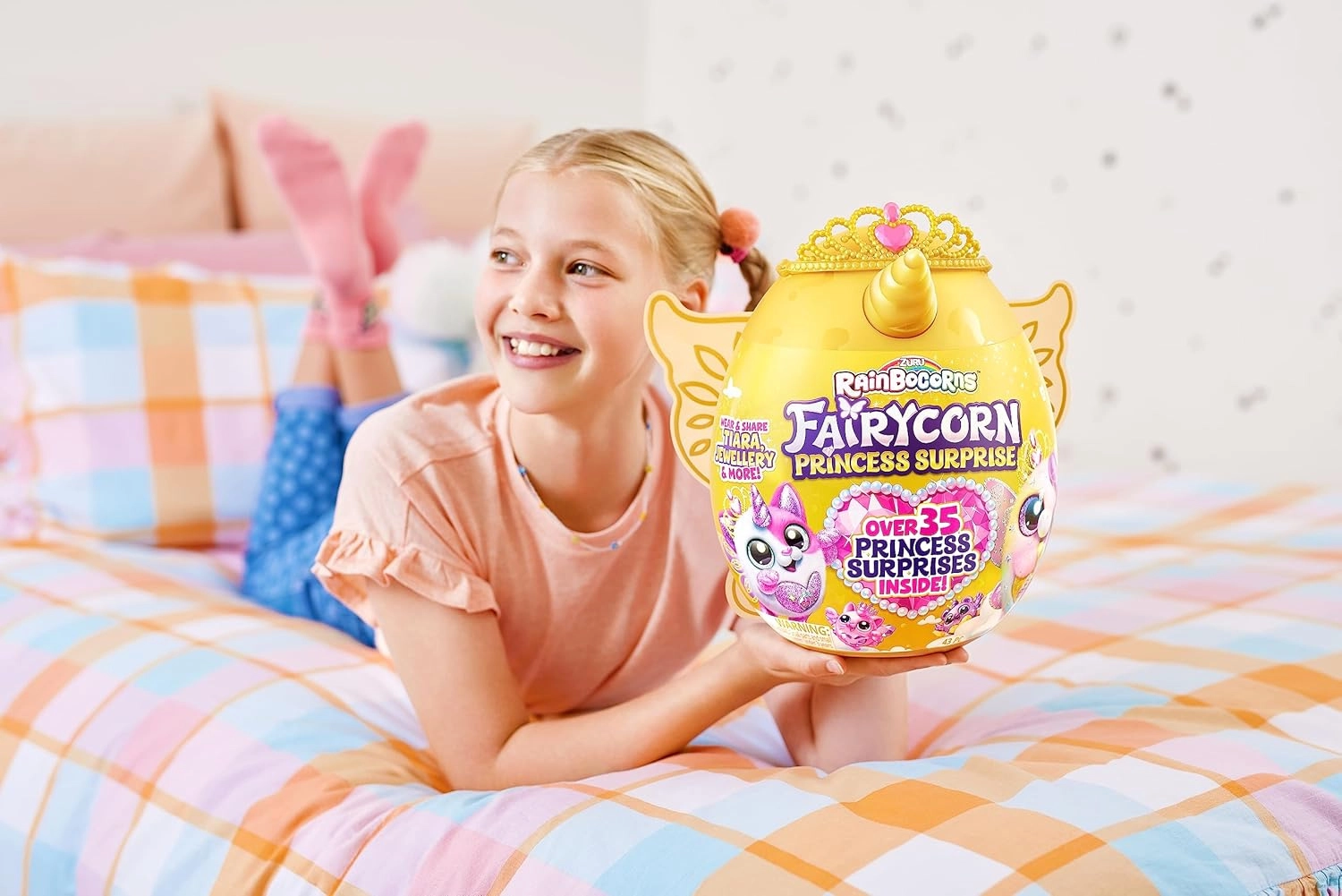 Mit der Fairycorn Princess Surprise wird jedes Öffnen des goldenen Eis zu einem märchenhaften Moment. Im Inneren wartet eine Plüsch-Prinzessin‑Einhorn mit glitzernden Details, Herzchen und vielen Accessoires, die kreatives Spiel und gemeinsame Zeit fördern. Jede Packung bringt eine andere Kombination aus Figuren und Accessoires – sammeln Sie sie alle!