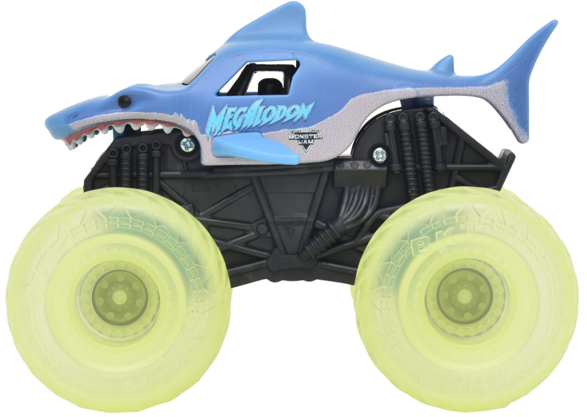 Der beliebte Megalodon, inspiriert vom prähistorischen Hai, überzeugt mit realistischen Karosseriedetails in Blau‑Grau-Tönen, Flossen und Zähnen, die den aggressiven Look unterstreichen. Große, transparent getönte Räder und ein robustes Chassis eignen sich ideal für Stunts zu Hause und unterwegs.