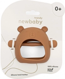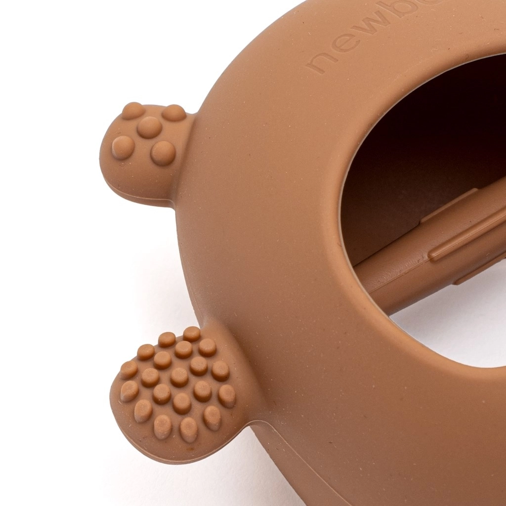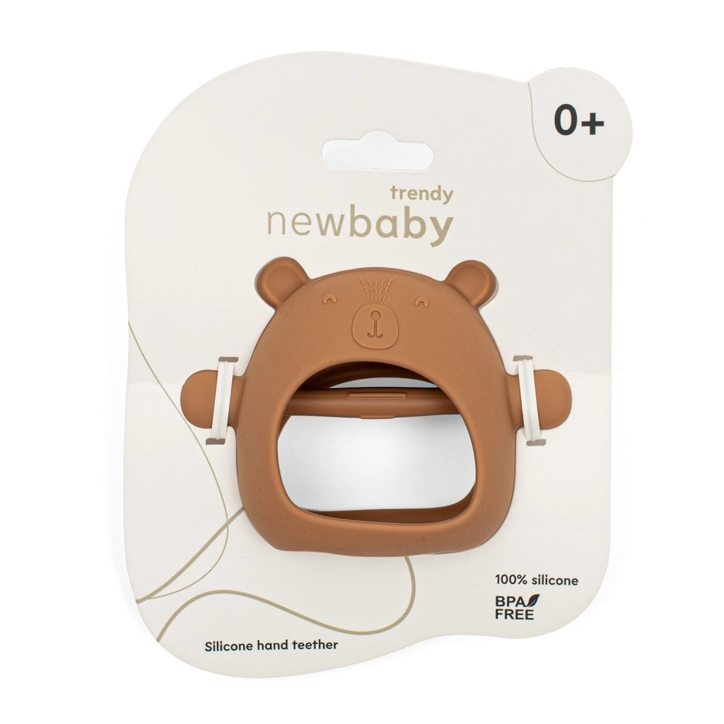 Der Beißring New Baby Trendy ist für ein bequemes Greifen und eine sanfte Zahnfleischmassage konzipiert. Das minimalistische Design im karamellbraunen Ton passt zu jedem Outfit und Kinderwagen – praktisch und stylisch zugleich.