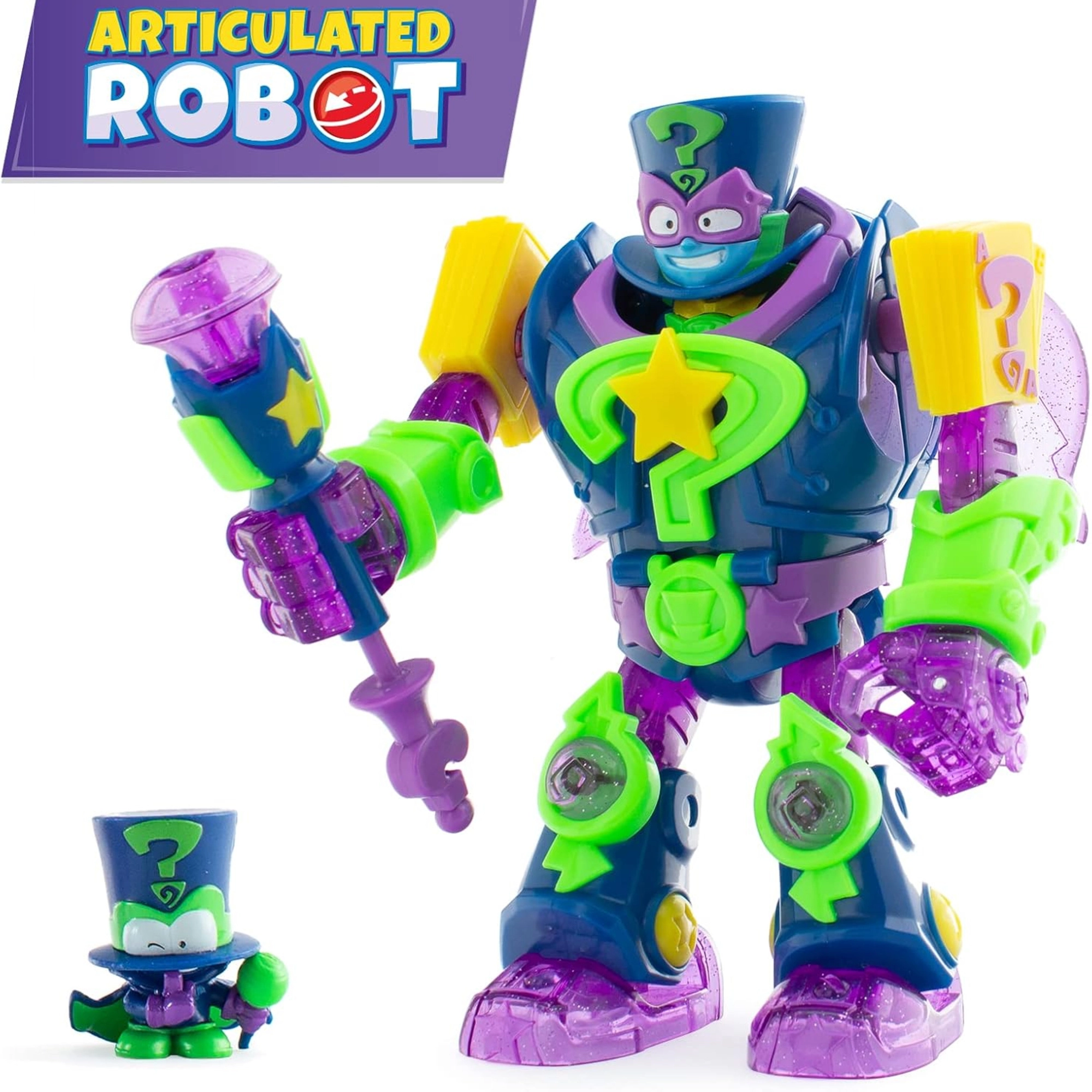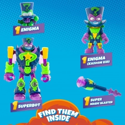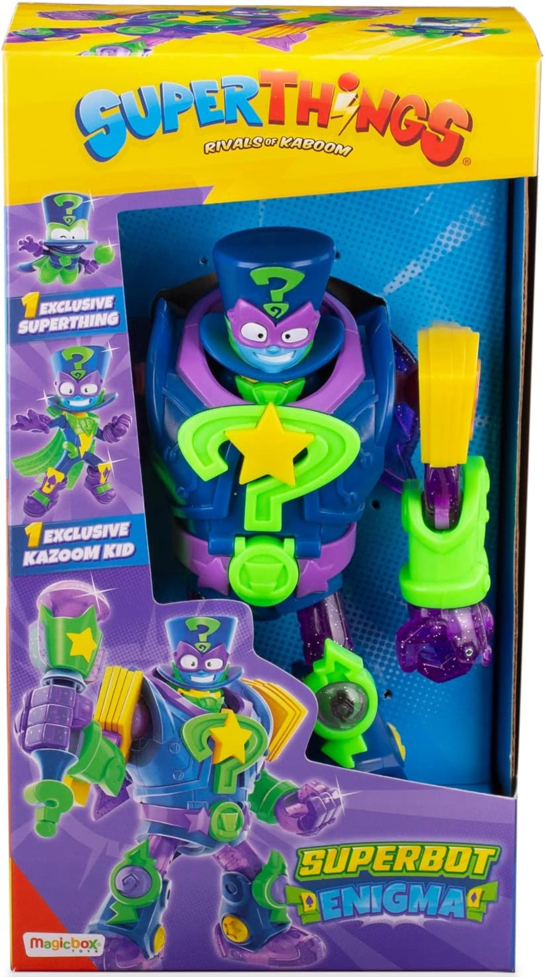 Der SuperThings Enigma Superbot verbindet markantes Design, funktionale Mechanismen und spannende Spielmöglichkeiten. Dank der beweglichen Arme und Beine lässt sich der Roboter leicht posieren und es können actionreiche Szenen nachgestellt werden. Auf Knopfdruck entfalten sich die mechanischen Flügel für dramatische Fluchten und Flüge über Kaboom City.