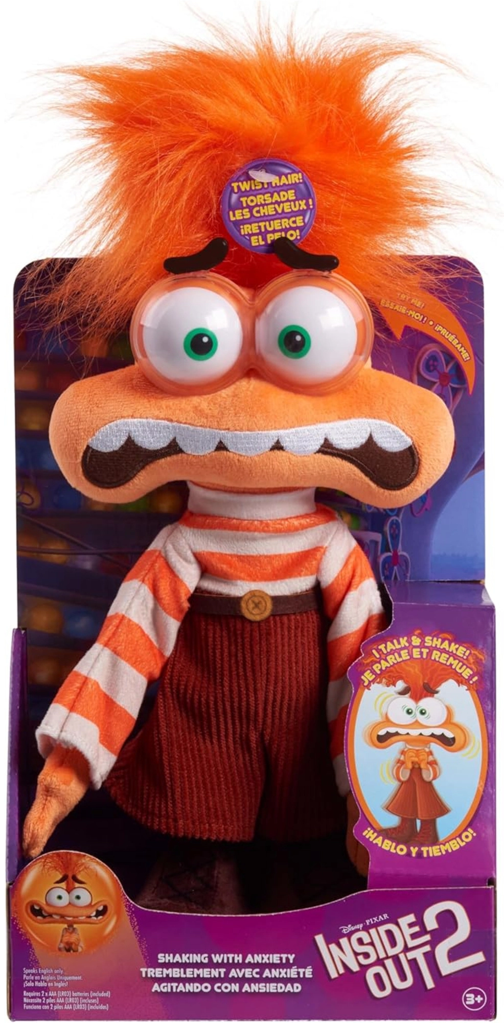 Der interaktive Angst-(Anxiety)-Plüsch besticht durch orange Farbtöne, ausdrucksstarke Augen und zerzauste Haare. Er ist etwa 32 cm groß, angenehm weich und ideal für den täglichen Spielspaß und zum Einschlafen. Durch Drehen des Kopfes wird das Vibrieren aktiviert und beliebte Filmsätze auf Englisch ertönen – eine tolle Kombination aus Spaß und Anregung für die Fantasie.