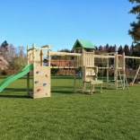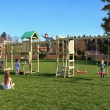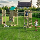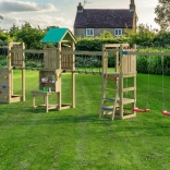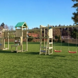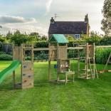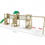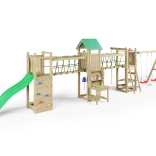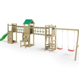 Der Spielplatz ist für viele Stunden aktive Outdoor-Unterhaltung konzipiert. Der hölzerne Turm mit Dach bietet Schatten und Rückzugsraum, die Hängebrücke schult die Koordination und die Kletterwand mit Griffen und Seil fördert Kraft und Geschicklichkeit. Die 2,2-m-Rutsche garantiert flotte Abfahrten, während sich zwei Schaukeln für Kinder aller Altersklassen eignen.