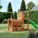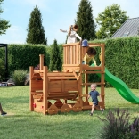 Dank der durchdachten Lösung eignet sich das Set für Familiengärten und bietet Spaß für bis zu 5 Kinder gleichzeitig (max. 50 kg pro Nutzer). Die Montage wird durch ein komplettes Set an Verbindungsmaterial, Werkzeug und eine illustrierte Anleitung erleichtert. Der Spielplatz unterstützt die Entwicklung der Grobmotorik, Koordination und sozialer Fähigkeiten beim gemeinsamen Spiel.