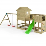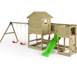 Zwei verstellbare Schaukeln, eine Kletterwand und ein Sandkasten mit Tischchen unter der Plattform beschäftigen mehrere Kinder gleichzeitig und fördern Motorik sowie Fantasie.