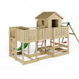 Das überdachte Spielhaus mit Schutzgeländer fördert kreatives Spiel. Auf die Plattform gelangen Kinder über die Leiter mit Metall-Sprossen oder über die Kletterwand mit bunten Griffen.