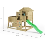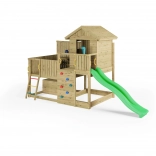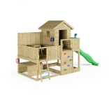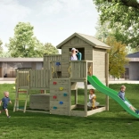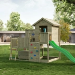 Das FUNGOO Sweet House ist ein durchdachtes Set für Kinder ab 3 Jahren, das Kletter-, Rutsch- und kreative Aktivitäten vereint. Die überdachte Plattform mit Holzdach bildet ein gemütliches Häuschen für Rollenspiele, während die lange grüne Rutsche und die Kletterwand mit bunten Griffen natürliche Bewegung und Koordinationsentwicklung unterstützen. Der untere Sandkasten und der Picknicktisch laden zum Ausruhen und zu Sinneserfahrungen ein.
