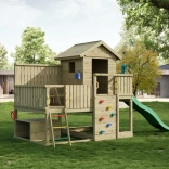 Massives Holz mit Druckimprägnierung (KDI) sorgt für Langlebigkeit und Witterungsbeständigkeit. Zusätzliche Sicherheit bieten Griffe, Geländer und rutschhemmende Leitern. Dank der Kapazität von bis zu 10 Kindern ist das Set ideal für Geschwister und Freunde – jeder findet seine Beschäftigung ohne Warten.
