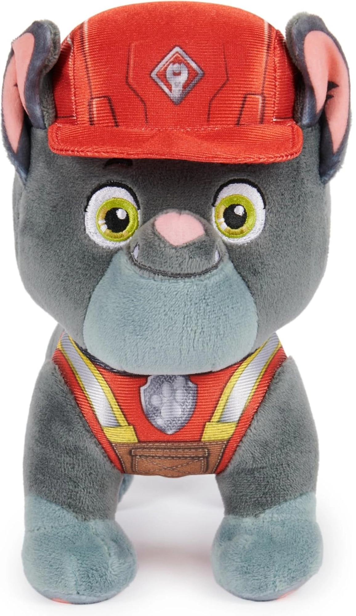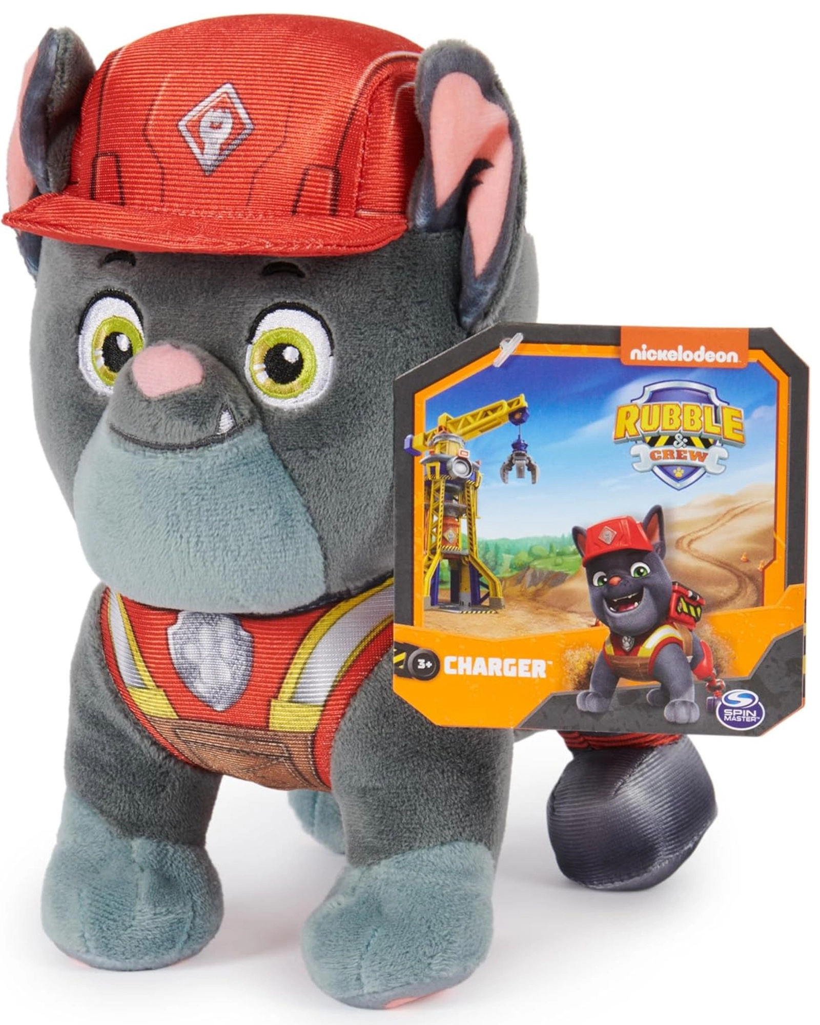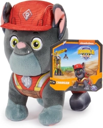 Plüschtier Charger ist ein energiegeladener Französischer Bulldogge aus der Serie PAW Patrol: Rubble & Crew, wo er beim Transport schwerer Lasten hilft. Dieses hochwertig verarbeitete Spielzeug von Spin Master fängt sein Aussehen originalgetreu ein – vom roten Helm und der Weste mit reflektierenden Elementen bis hin zum weichen grau-silbernen Fell und den großen gestickten Augen.