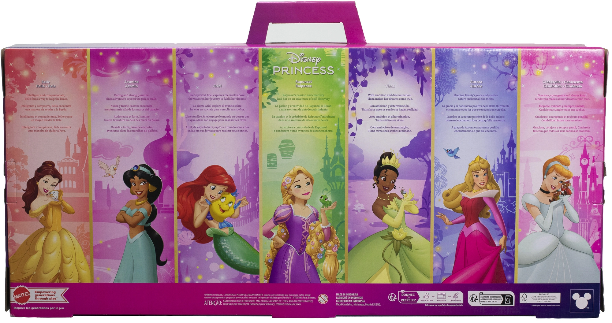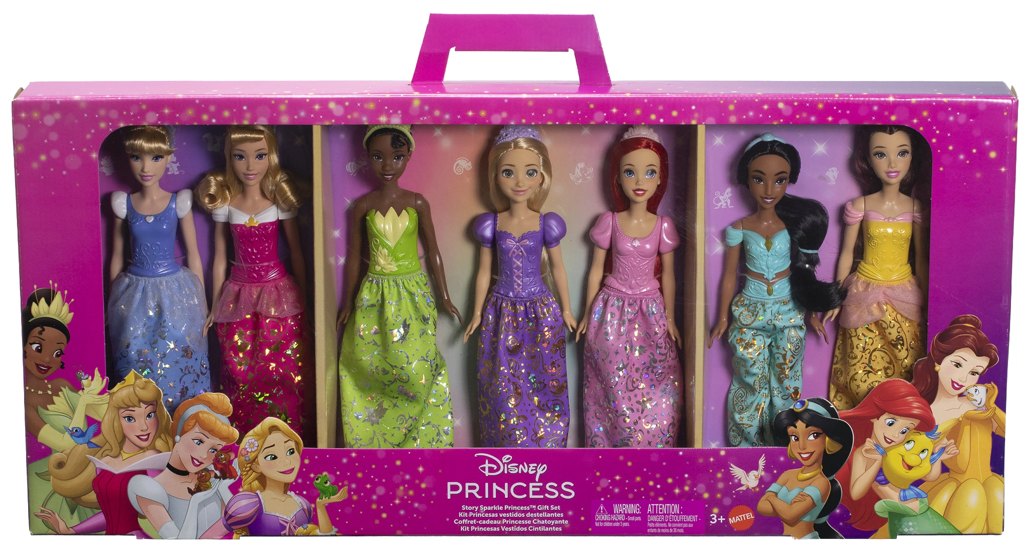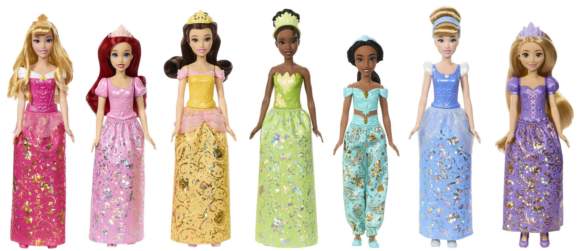 ARIEL, AURORA, BELLE, ASCHENPUTTEL, JASMIN, RAPUNZEL und TIANA – eine komplette Auswahl für endlose Märchenabenteuer und Sammelspaß.