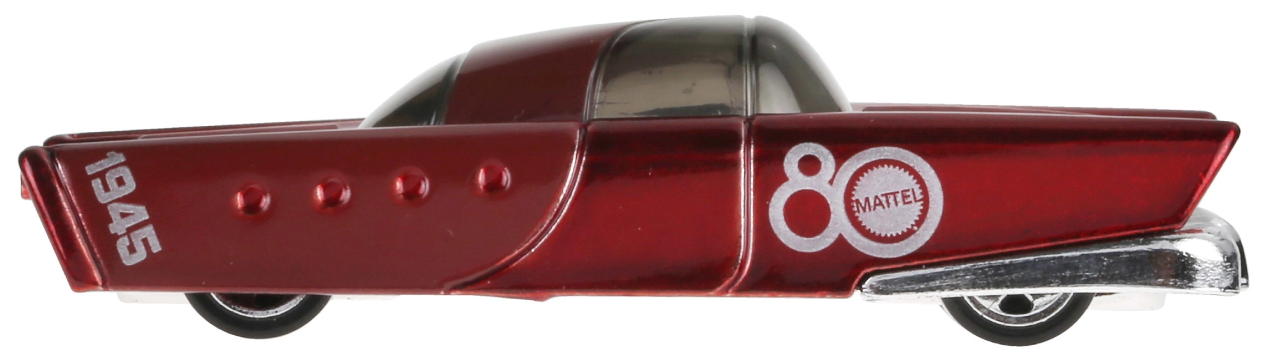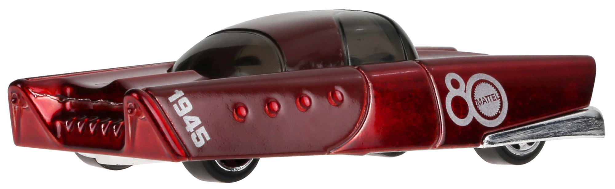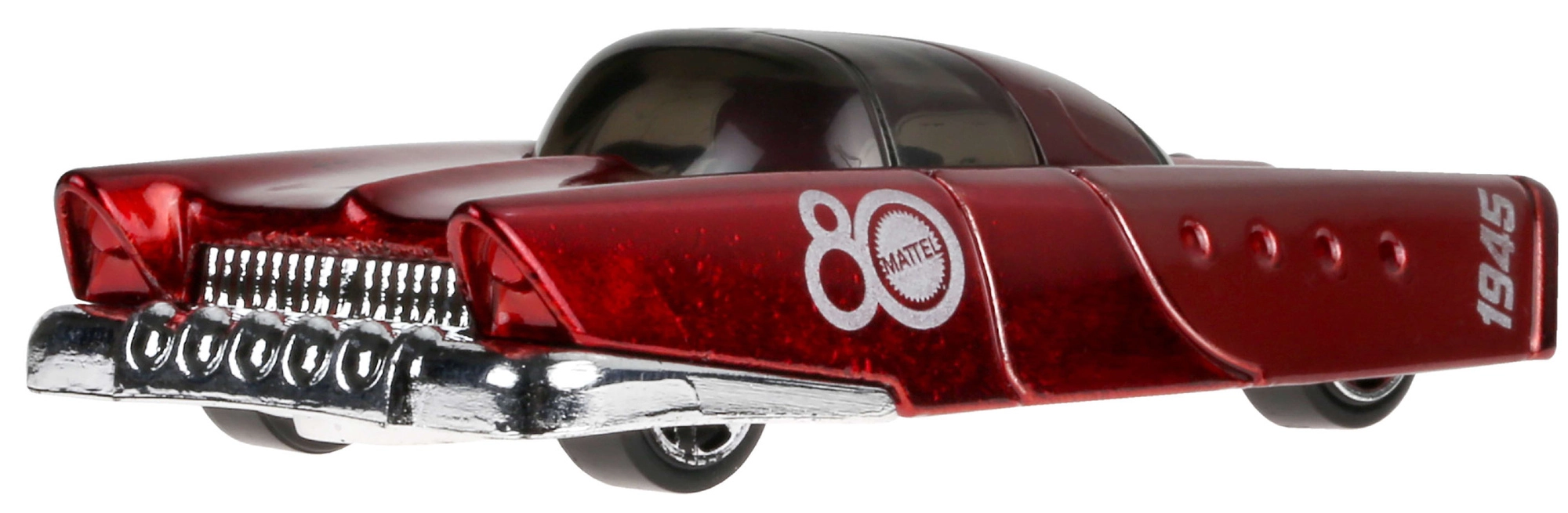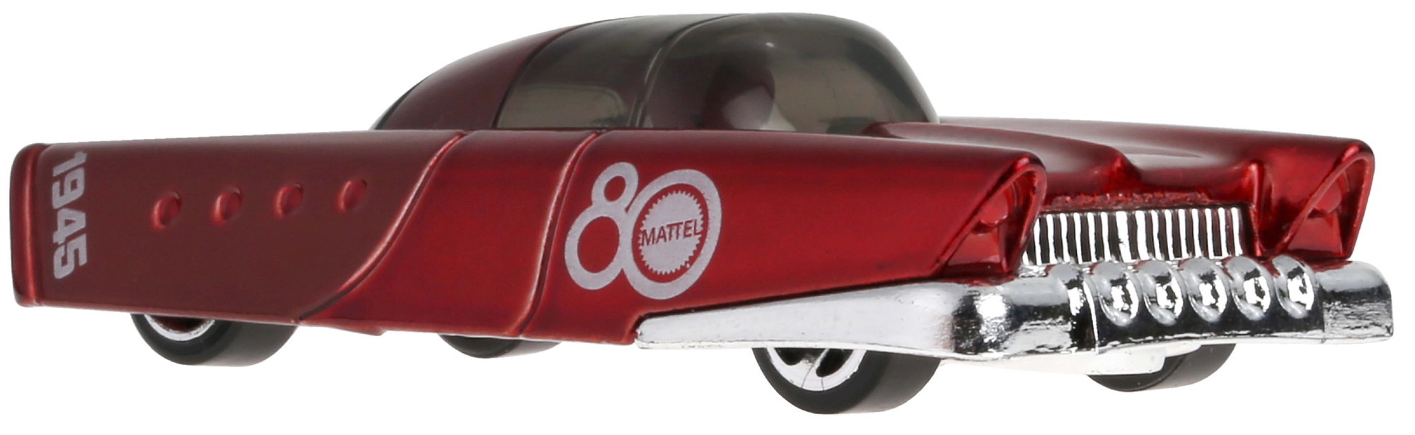 Die 80-Jahre-Mattel-Edition kommt in tiefem Rubinrot mit stylischen Grafiken „80 Mattel“ und der Zahl „1945“. Das Auto ist im klassischen 1:64-Maßstab – perfekt für die Vitrine und für dynamischen Spaß auf heimischen Bahnen.