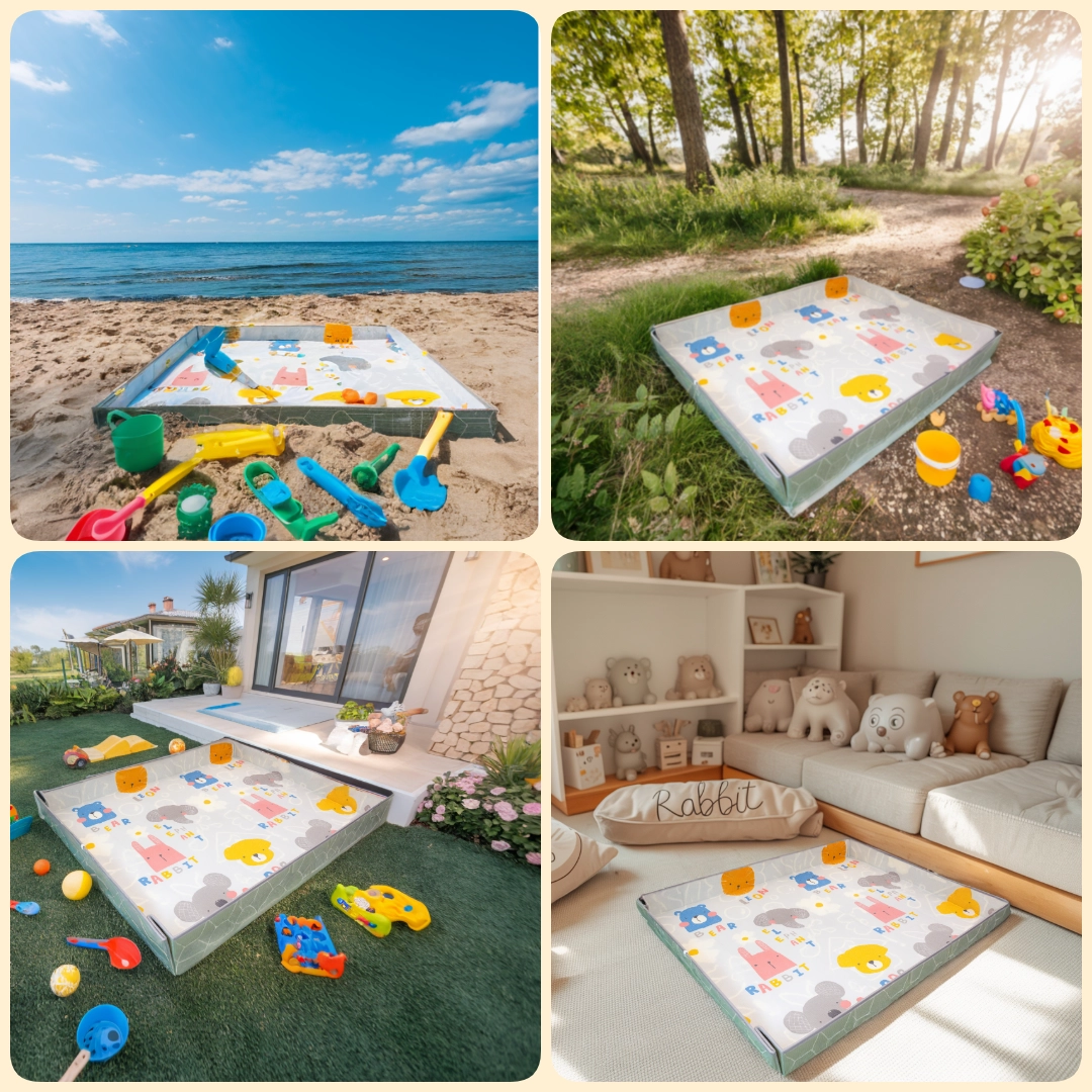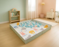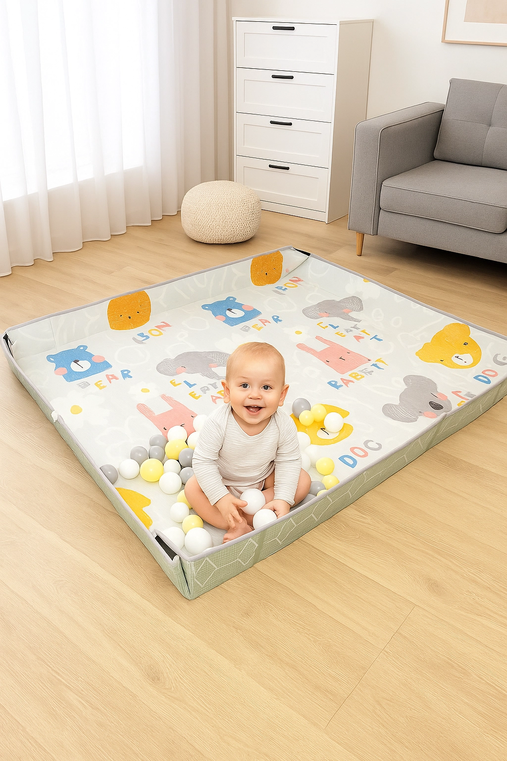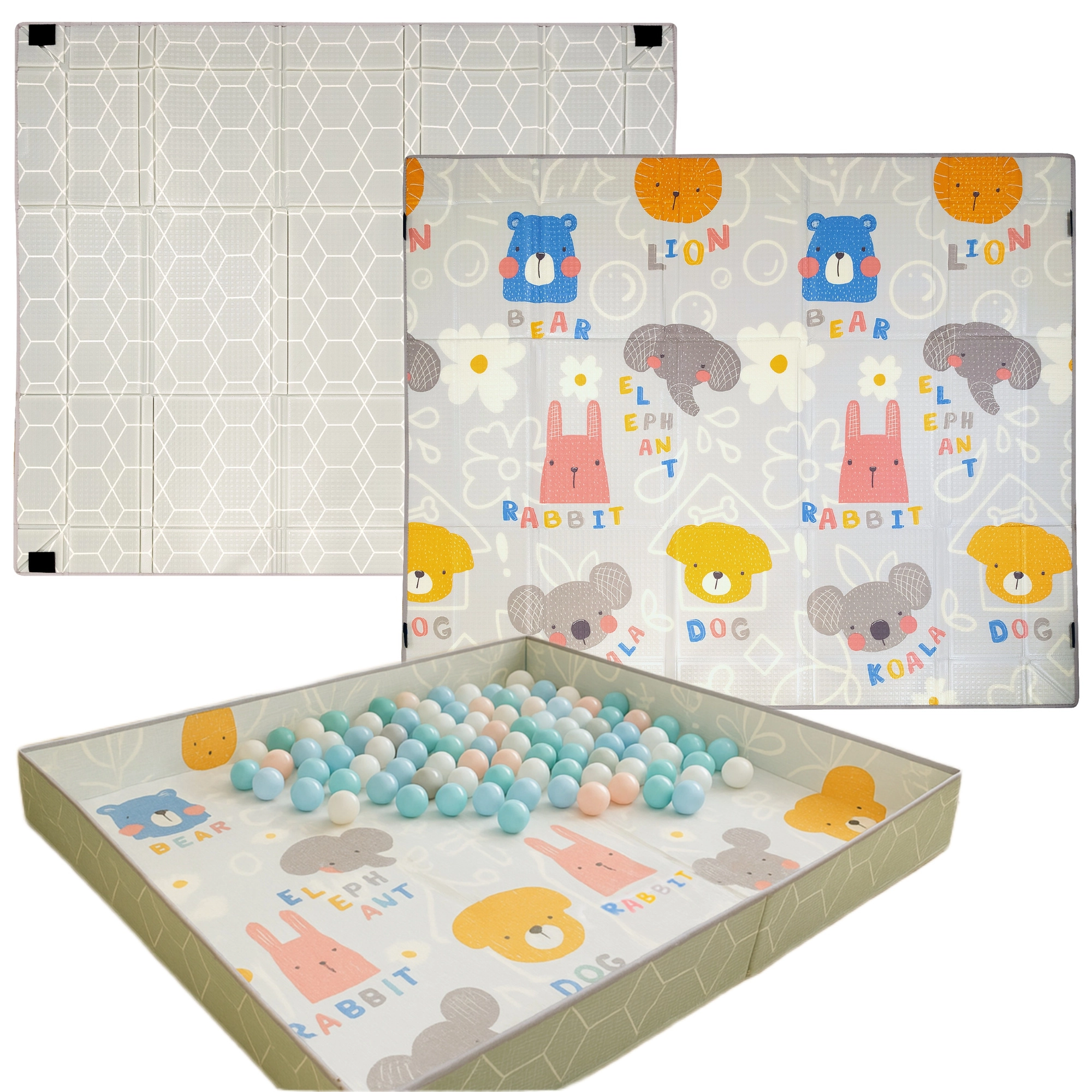 Spezielle Klettverschlüsse ermöglichen es, die Ränder in wenigen Augenblicken aufzurichten und einen weichen Laufstallbereich oder ein Ball Pit zu schaffen – einfach Bälle hinzufügen. Die Matte ist faltbar, leicht und einfach zu reinigen (ein feuchtes Tuch genügt). Im Lieferumfang ist zudem eine praktische Transporttasche mit Reißverschluss für bequemes Verstauen und Mitnehmen enthalten.