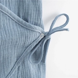 Musselin ist ein sehr atmungsaktives und federleichtes Gewebe, das eine freie Luftzirkulation ermöglicht und hilft, Überhitzung vorzubeugen. Das Material ist zugleich strapazierfähig, hält wiederholtem Waschen stand und wird mit der Zeit sogar weicher und angenehmer im Griff. Der Overall besteht aus 100% Baumwolle und erfüllt die strengen Standards des OEKO-TEX STANDARD 100 für die Sicherheit empfindlicher Babyhaut.