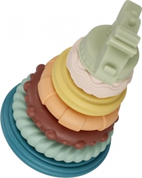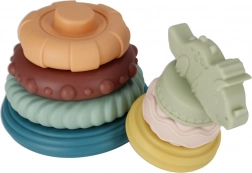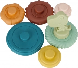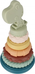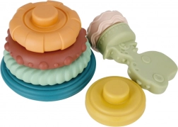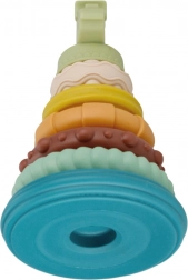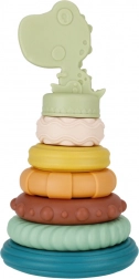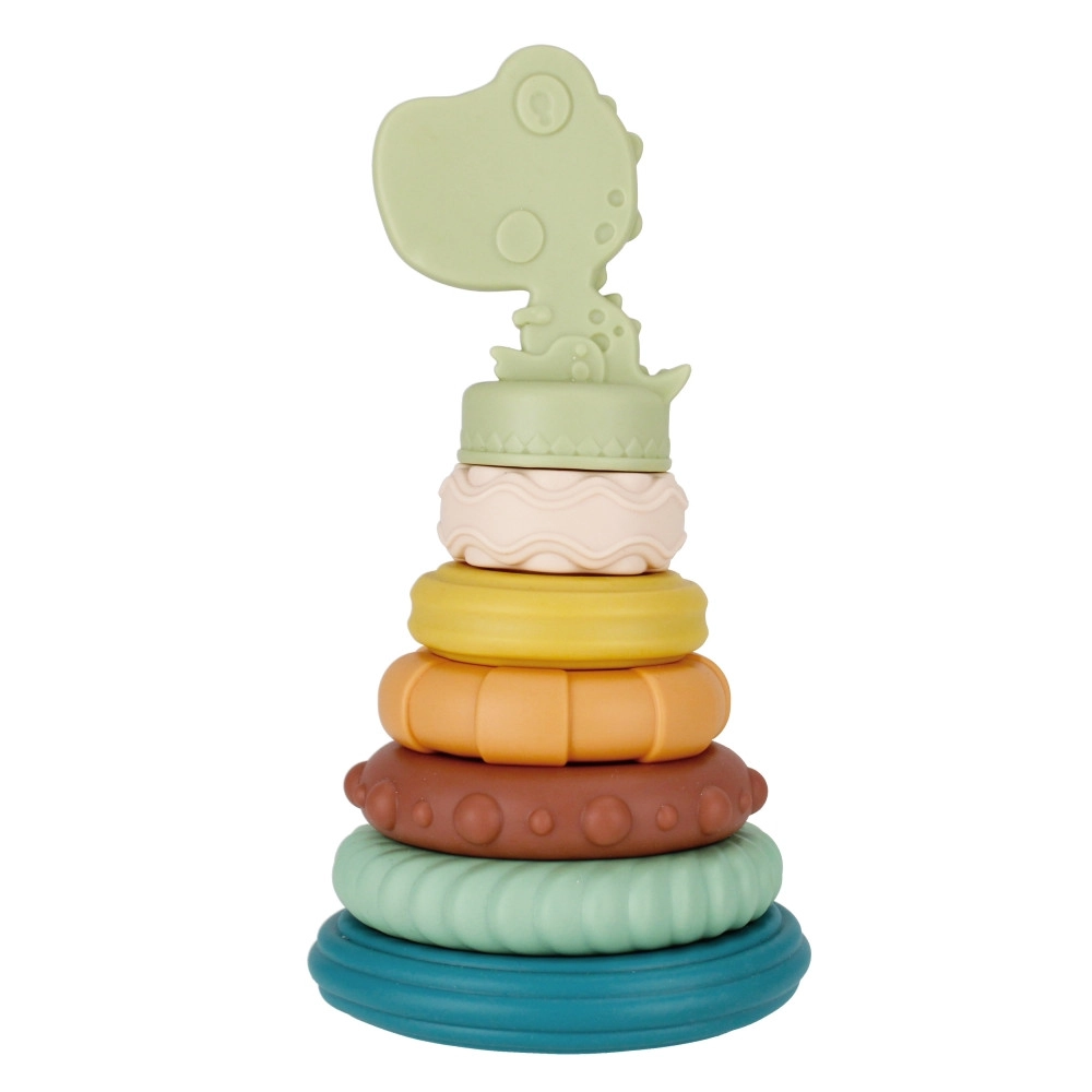 Die BAB BAM Steckpyramide mit Dinosaurier ist ein ideales sensorisches Spielzeug für Säuglinge und Kleinkinder. Farbige Ringe mit verschiedenen Oberflächen (Rillen, Noppen, Wellen) laden zum Entdecken, Kauen und Stapeln auf den Mittelstift ein. Das Kind trainiert spielerisch Greifen, Größensortierung und Koordination.