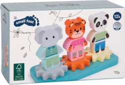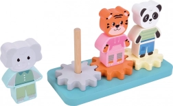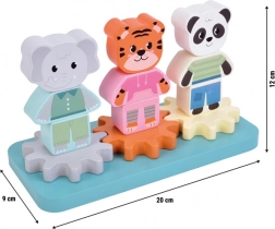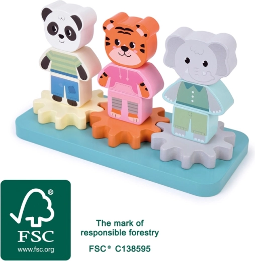 Drei niedliche Figuren – Elefant, Tiger und Panda – bestehen aus farbigen, stapelbaren Teilen, die Kinder sortieren, kombinieren und aufeinander bauen können. Das clevere Zahnrad-System verbindet alle Figuren: Durch das Drehen einer Figur bewegen sich alle, sodass Kinder Ursache und Wirkung unmittelbar erkennen.
