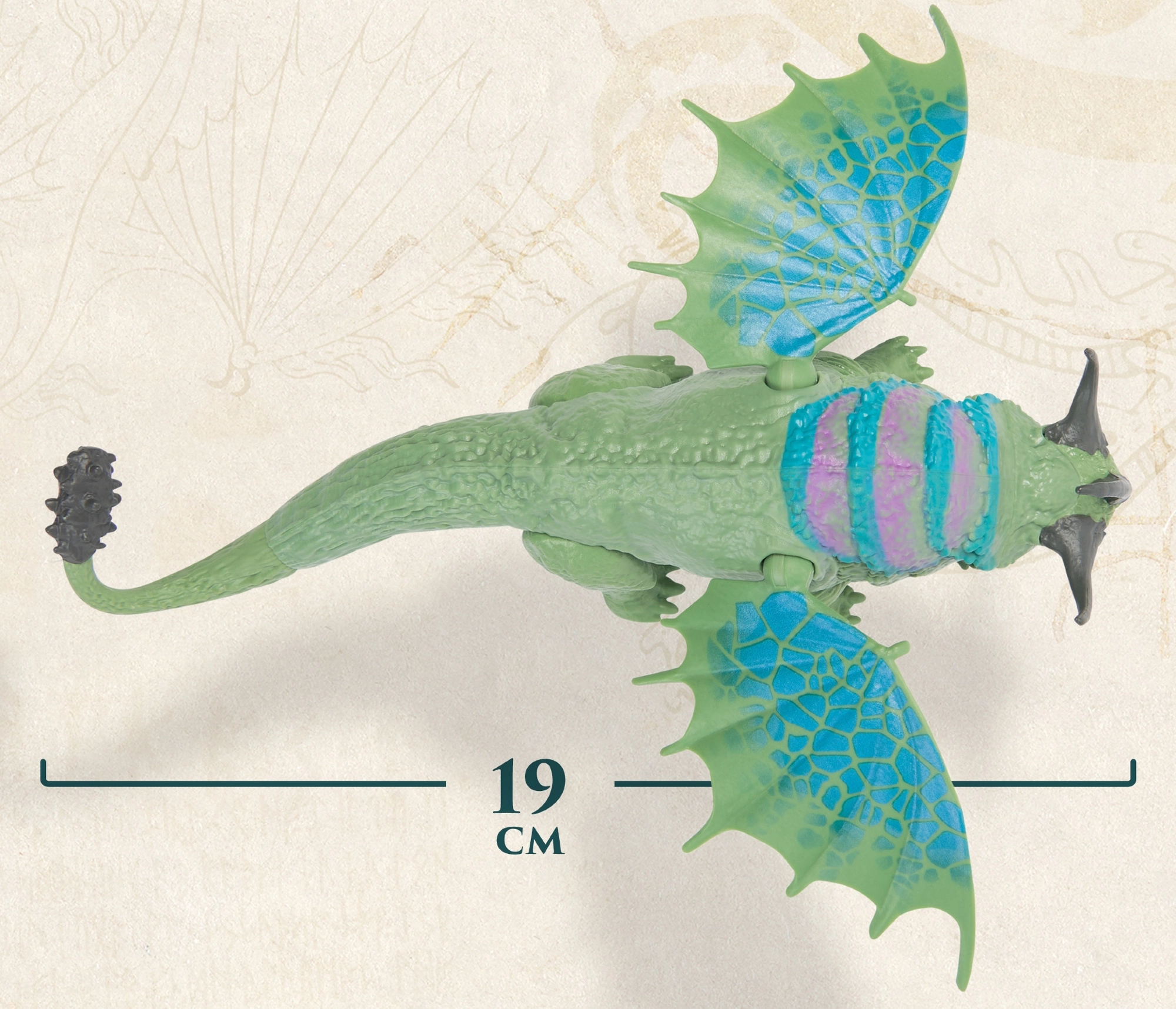 Die Rumblehorn-Figur beeindruckt mit massiver Statur, markanten Hörnern und großen Flügeln mit einzigartigem Muster. Sie ist vom Film-Universum der DREAMWORKS Dragons inspiriert und fängt das Aussehen des beliebten Drachen originalgetreu ein. Bewegliche Gelenke ermöglichen dynamische Posen – vom Start über Berk bis hin zu Kampfhaltungen.