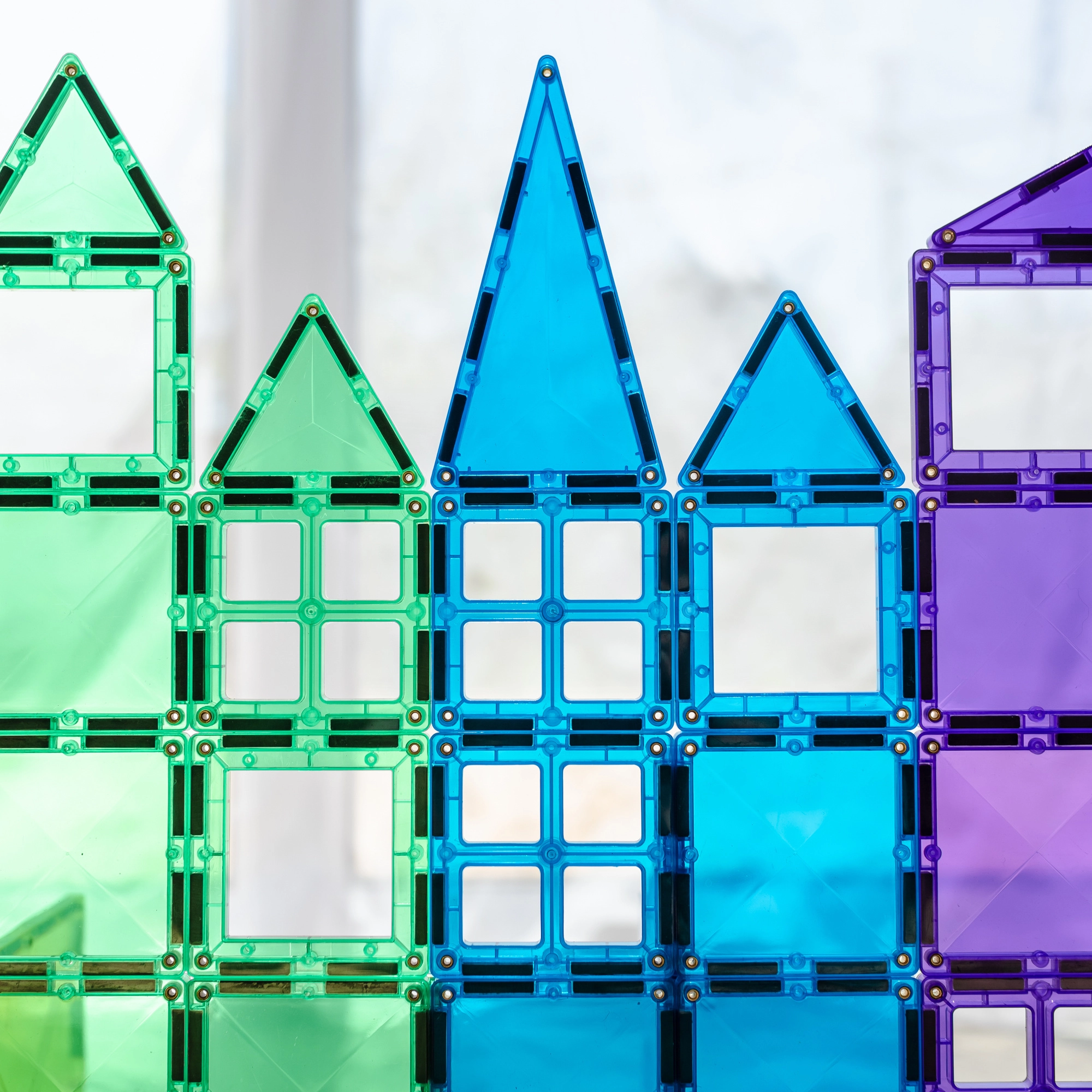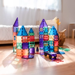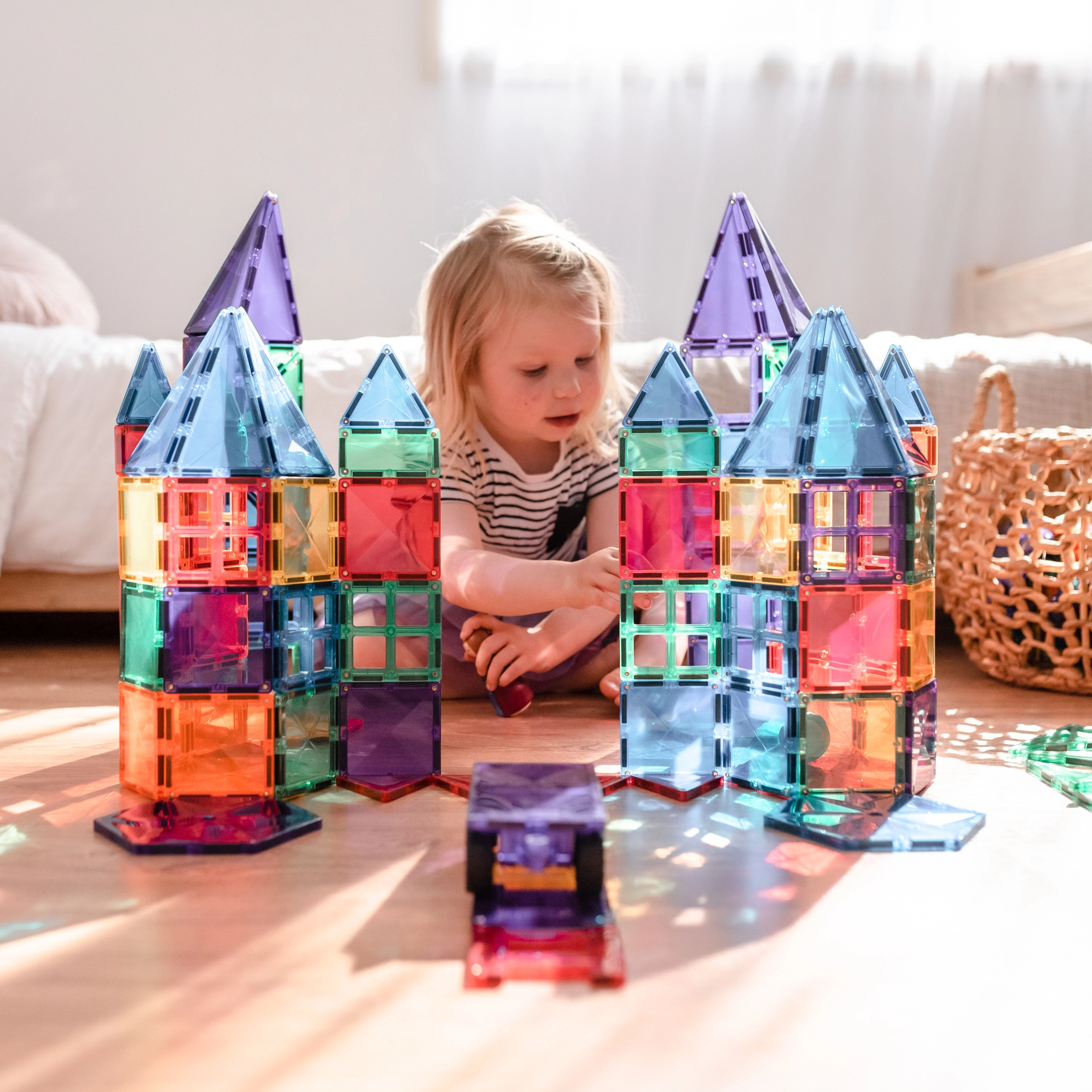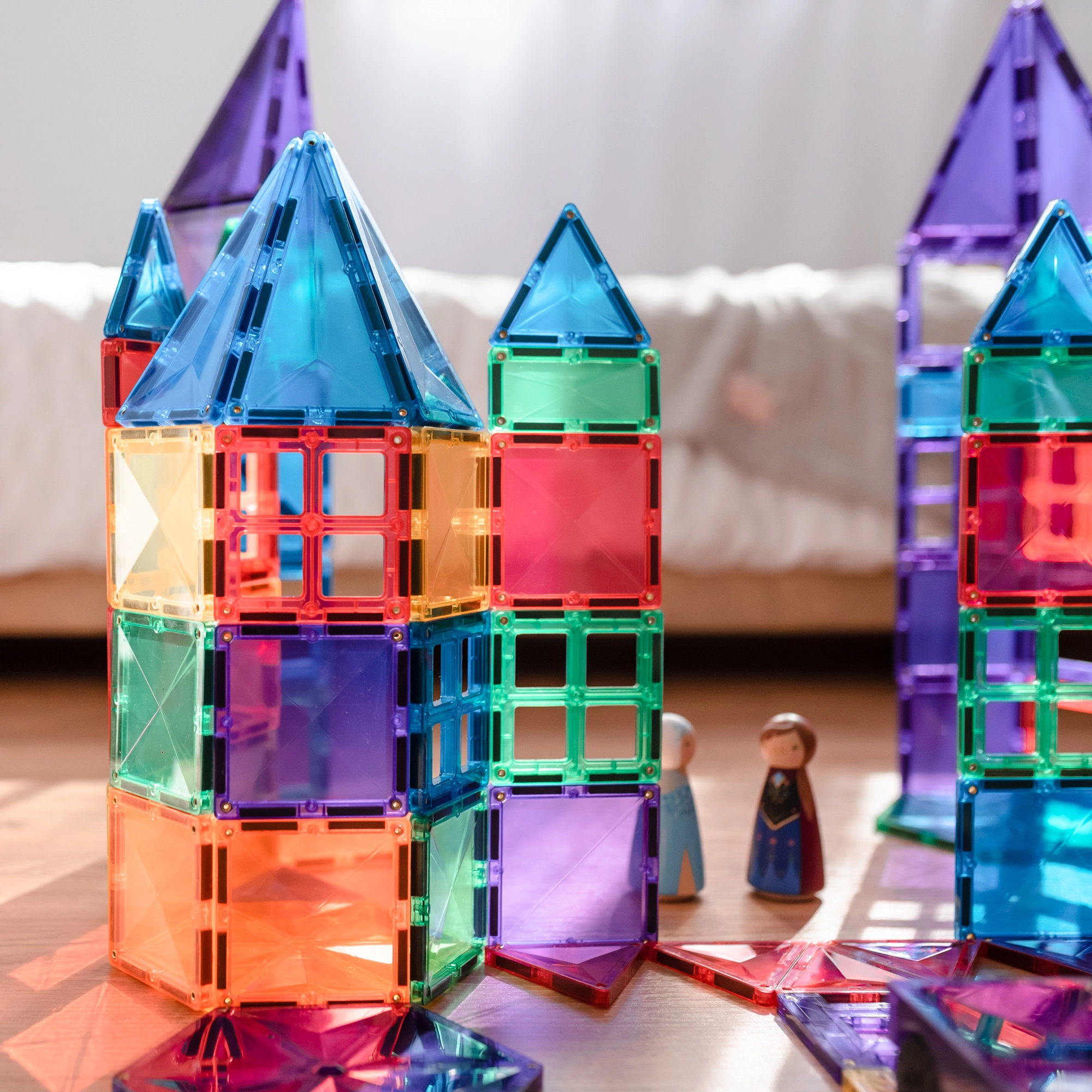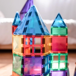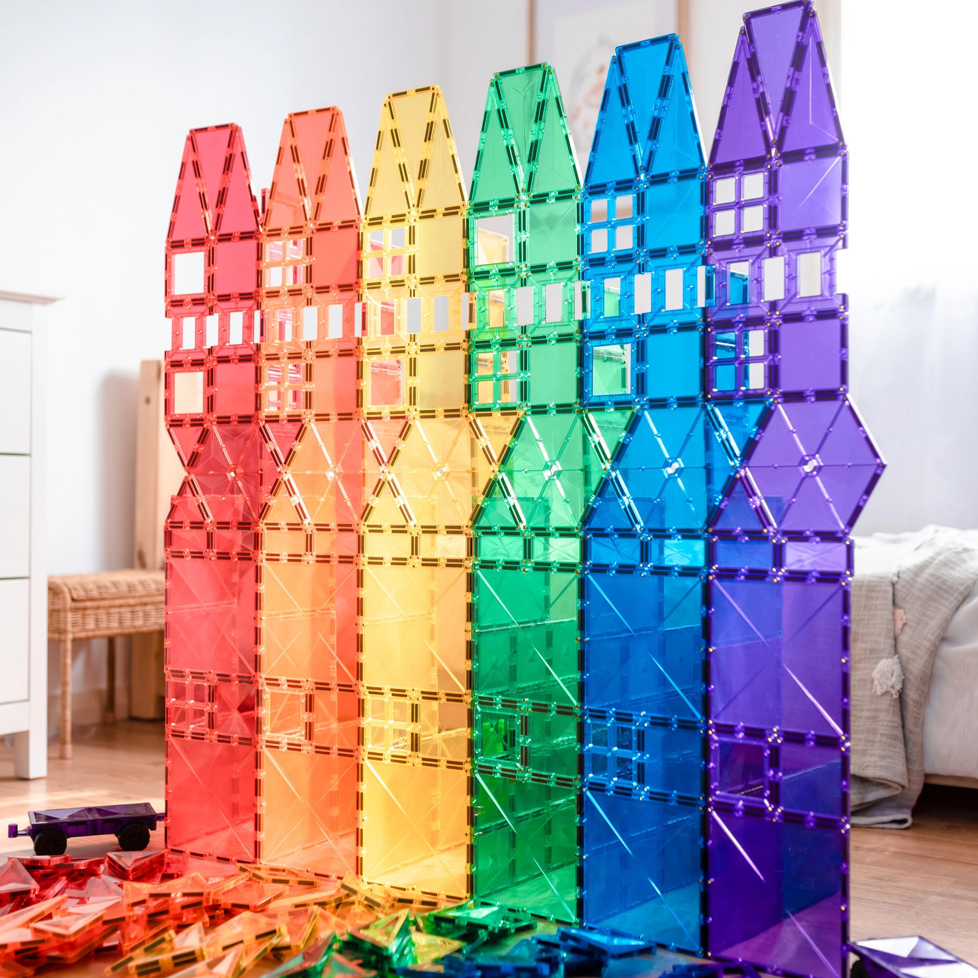 Transparente magnetische Kacheln in satten Farben ermöglichen es Kindern, hohe Türme, Schlösser und Häuser zu bauen und beim Spielen am Fenster oder mit einer Lampe die Welt von Licht und Schatten zu entdecken.