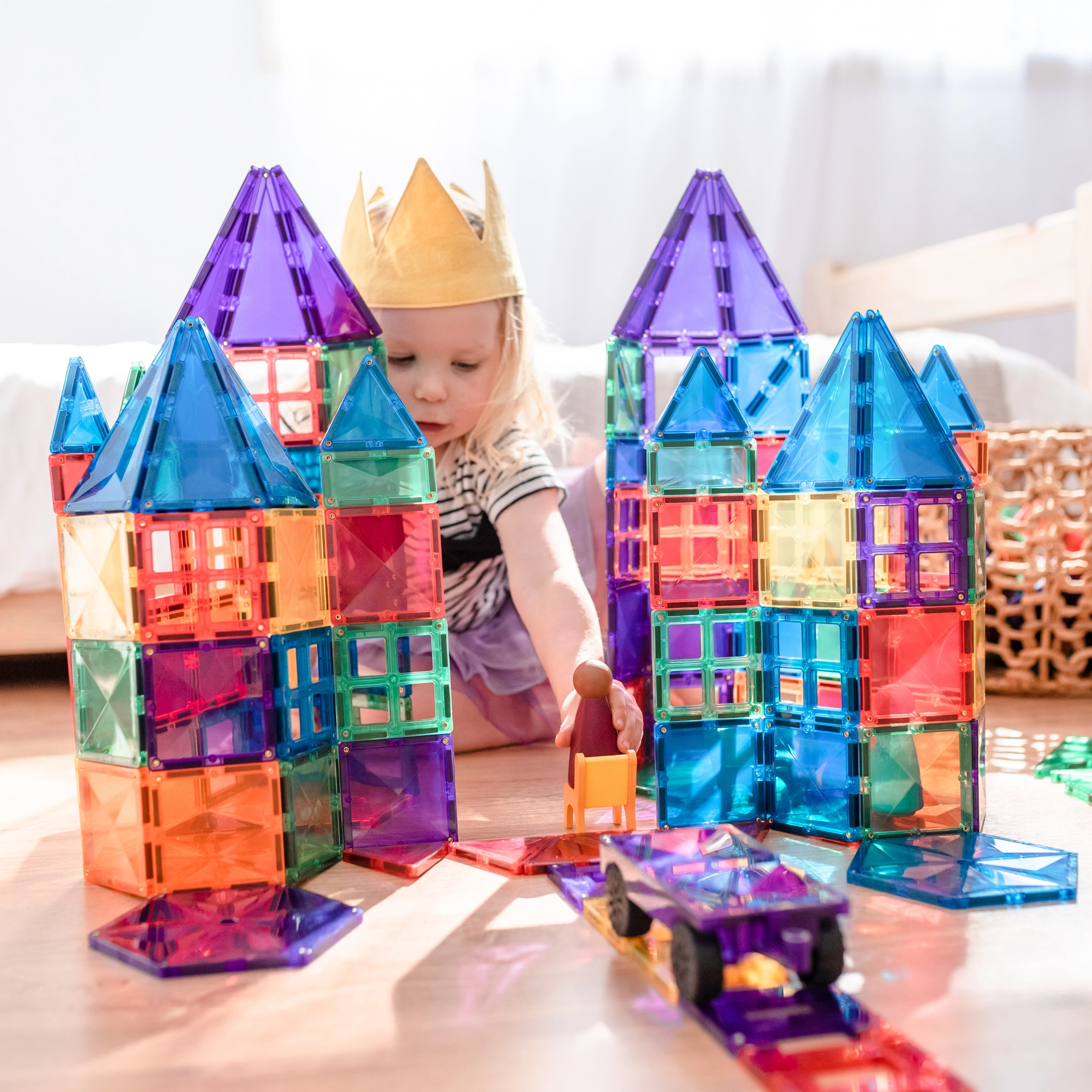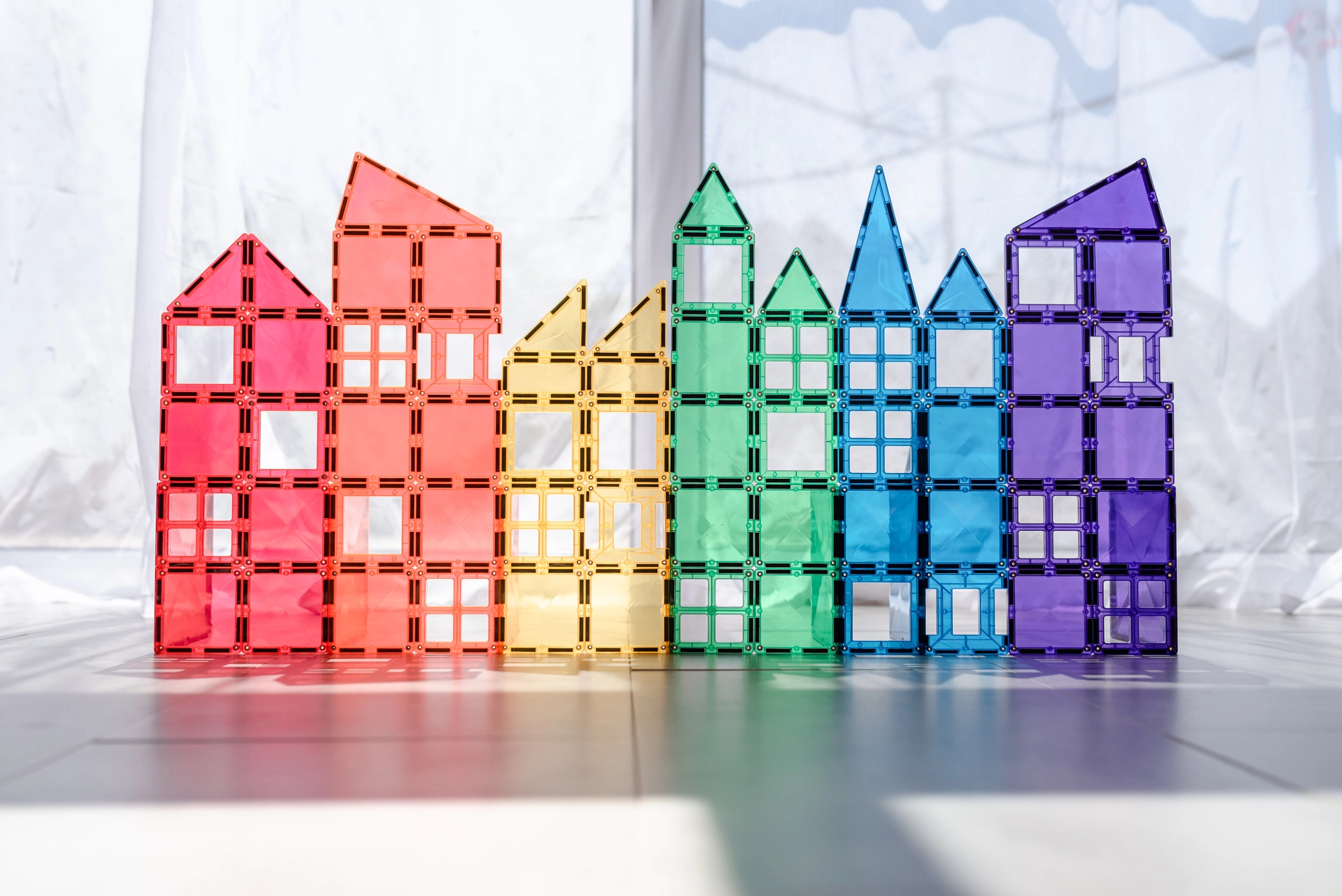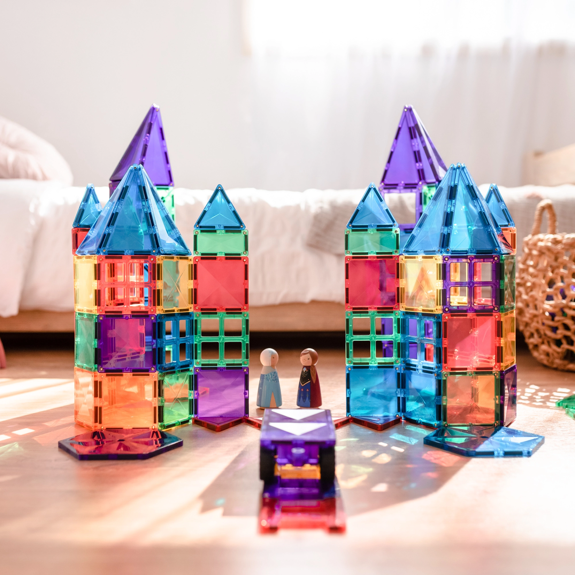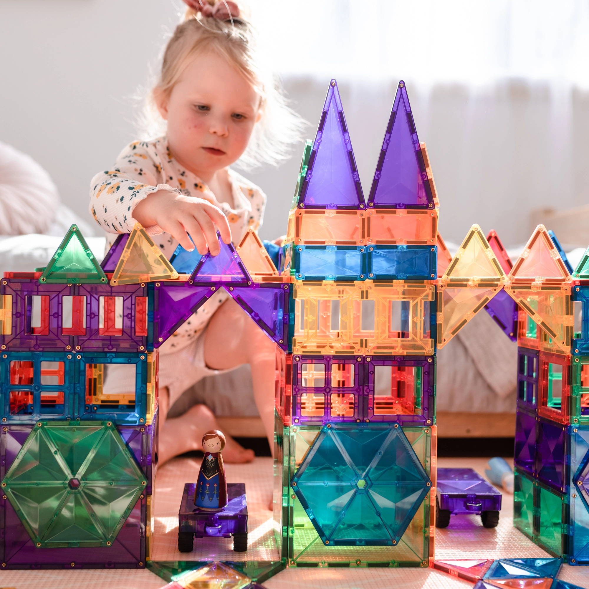 Transparente magnetische Kacheln in satten Farben ermöglichen es Kindern, hohe Türme, Schlösser und Häuser zu bauen und beim Spielen am Fenster oder mit einer Lampe die Welt von Licht und Schatten zu entdecken.