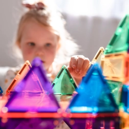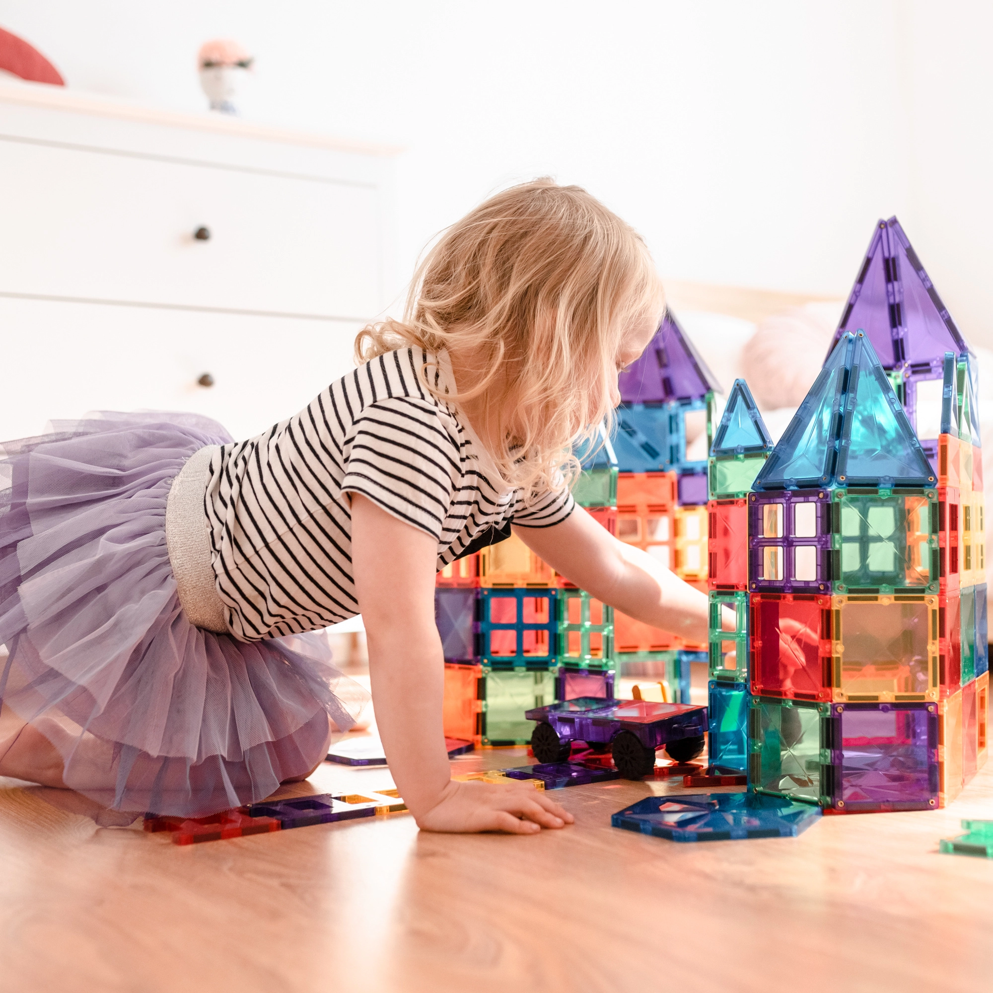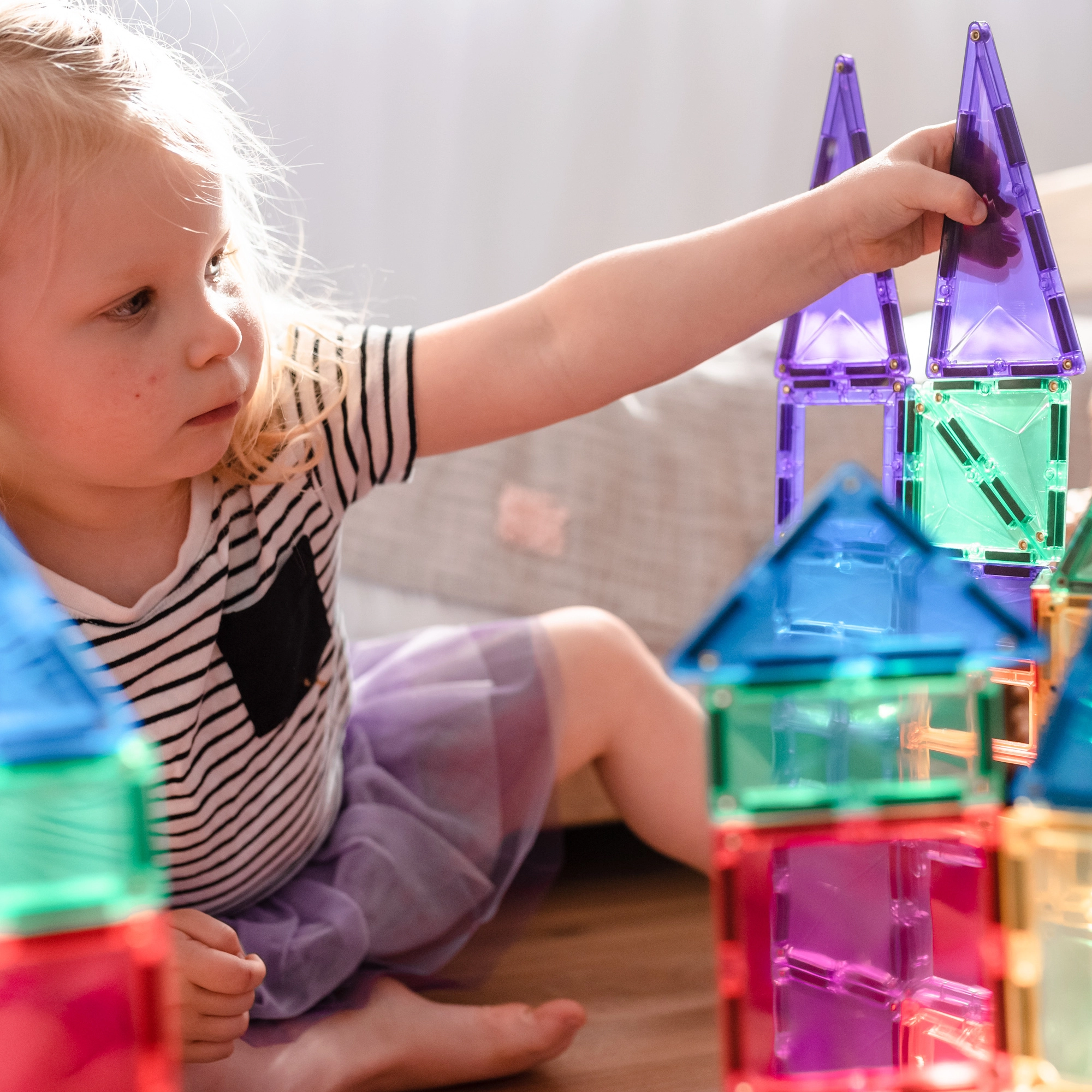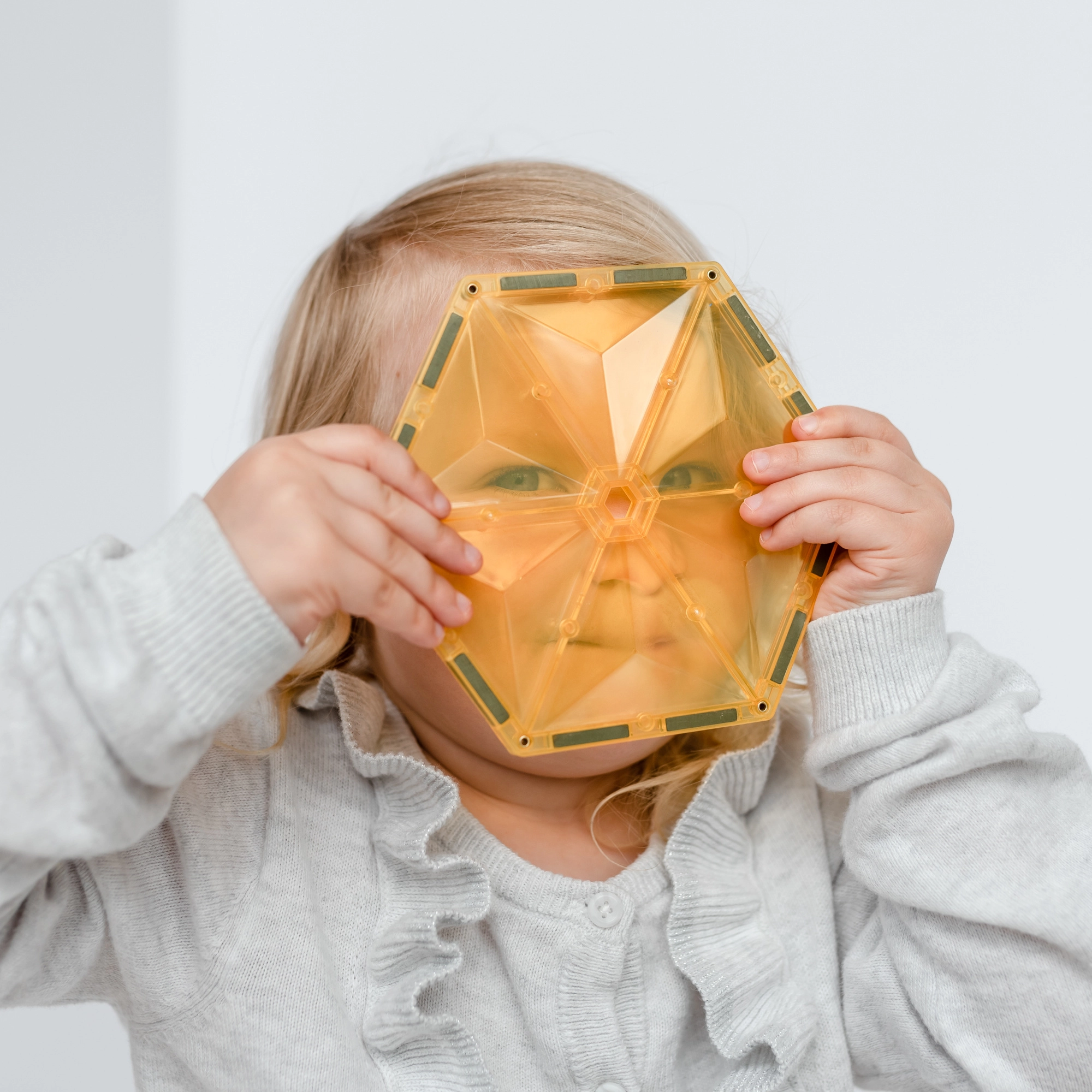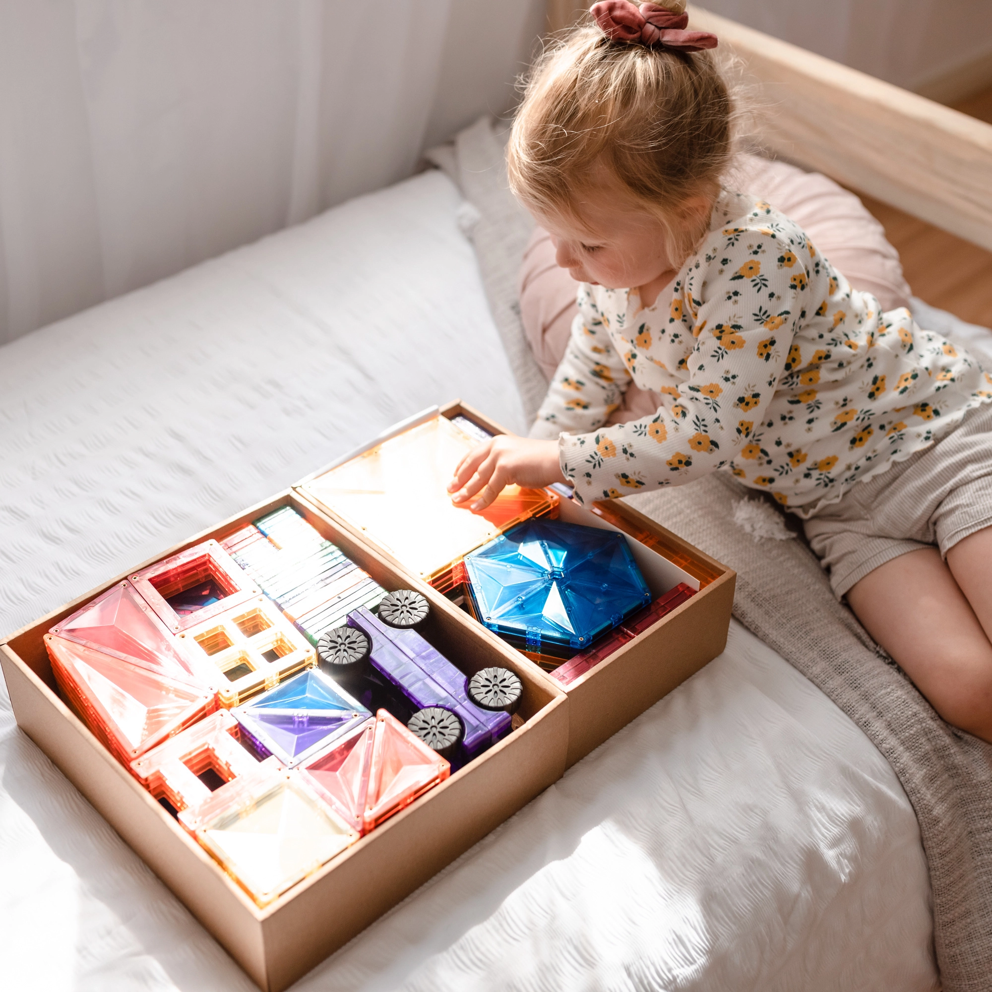 Transparente magnetische Kacheln in satten Farben ermöglichen es Kindern, hohe Türme, Schlösser und Häuser zu bauen und beim Spielen am Fenster oder mit einer Lampe die Welt von Licht und Schatten zu entdecken.