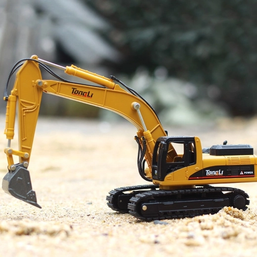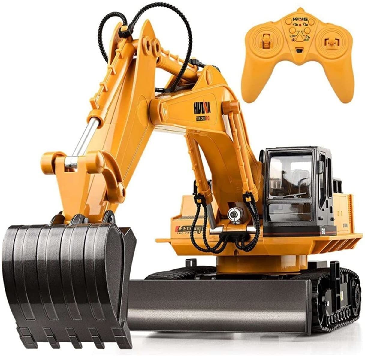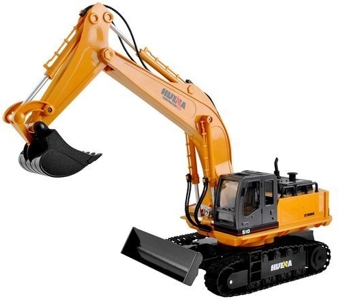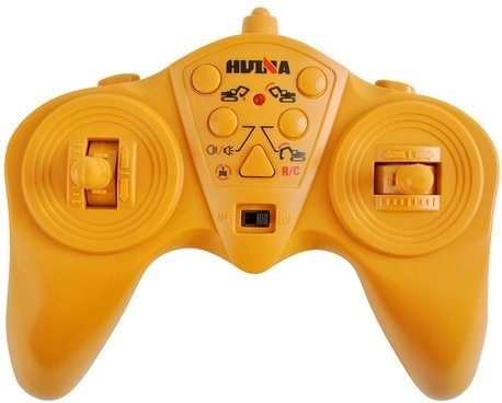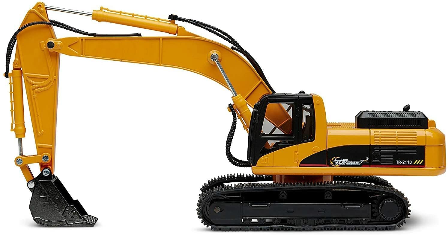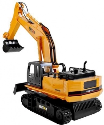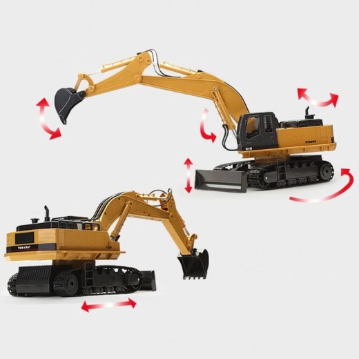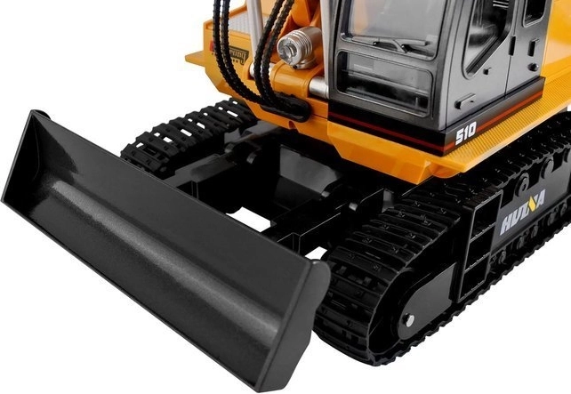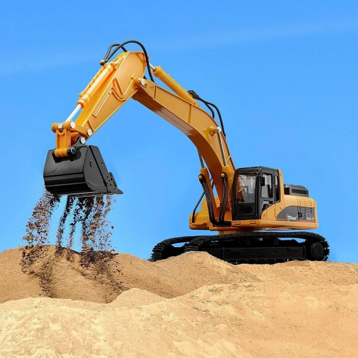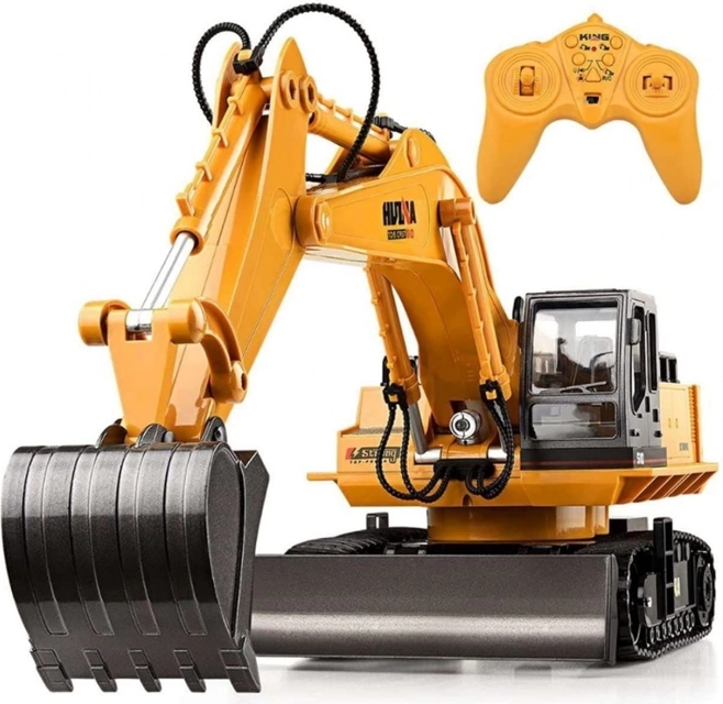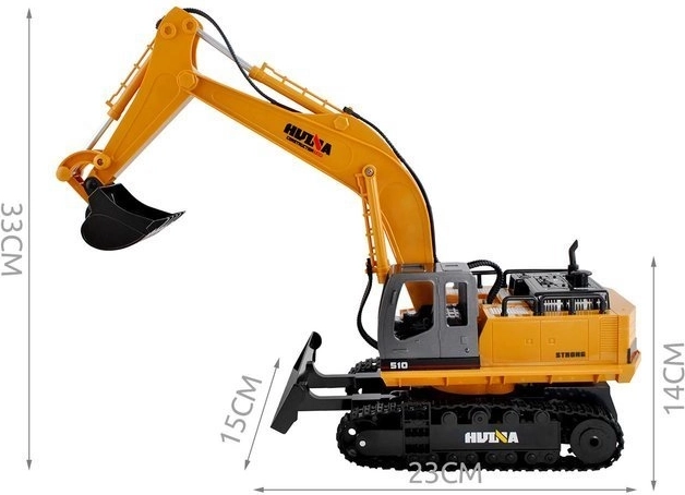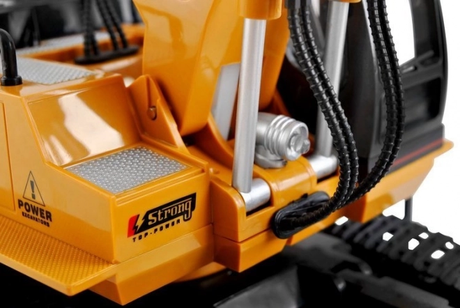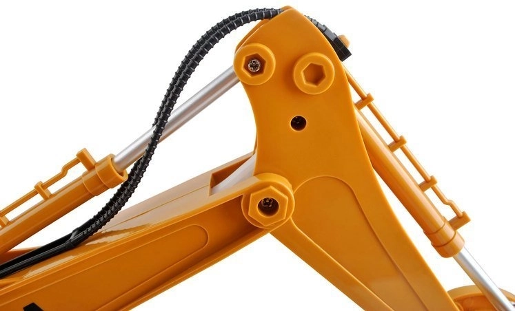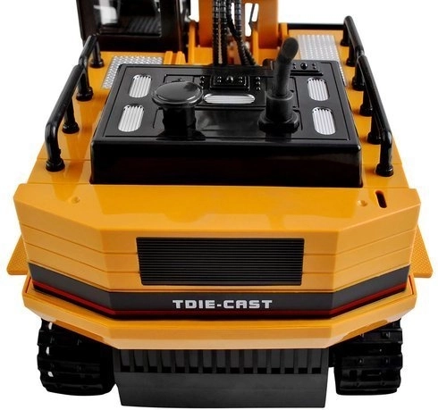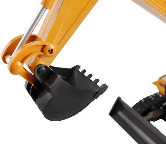 Der ferngesteuerte Bagger hat eine für massive Baufahrzeuge charakteristische Konstruktion und ein klassisches Farbschema - die gelbe Karosserie wird mit vielen kontrastierenden schwarzen Details kombiniert.