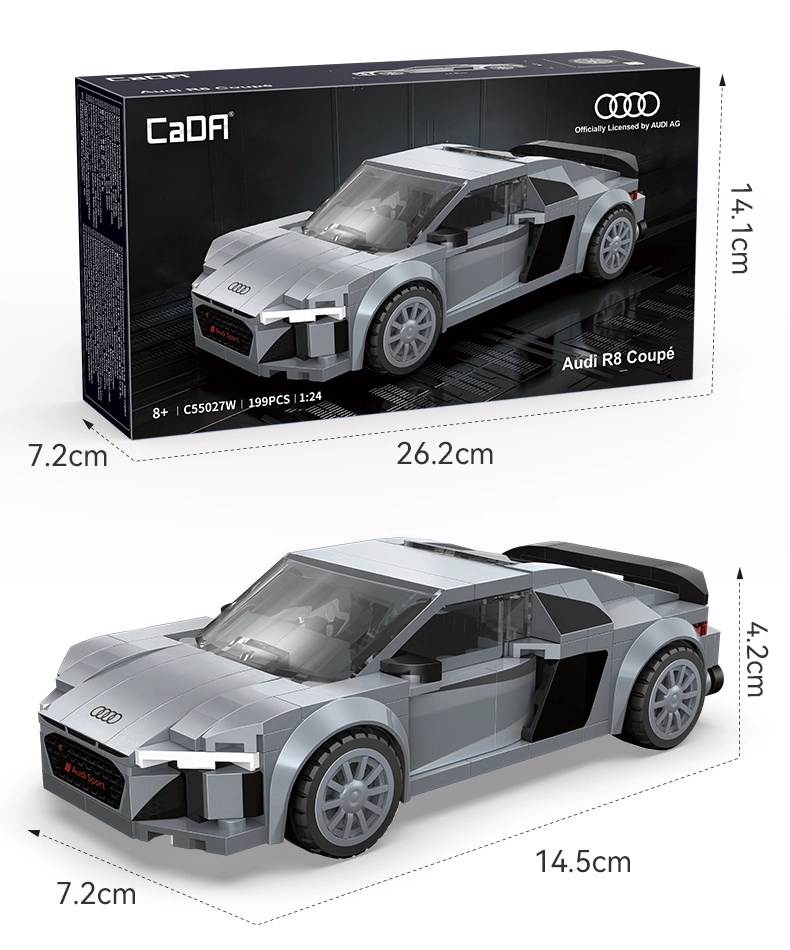 Dieser lizenzierte CaDA-Bausatz bildet die dynamischen Linien des AUDI R8 Coupé (2019) detailgetreu nach. Dank hochwertiger Teile und präziser Drucke ohne Aufkleber kommen die realistische Front mit schwarzem Gitter, die doppelten Lufteinlässe und die klaren Seitenkonturen hervorragend zur Geltung. Fertig aufgebaut misst das Modell ca. 14,5 × 7,2 × 4,2 cm und macht sich großartig im Regal oder auf dem Schreibtisch.