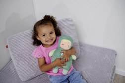 Die Squishbabies Plüschpuppe im zarten grünen Outfit ist zum Kuscheln, Beruhigen und für das erste Spielen gemacht. Dank weicher Materialien und des Outfits mit reliefartiger Cordstruktur bietet sie ein angenehmes Sinneserlebnis und wirkt zugleich beruhigend.