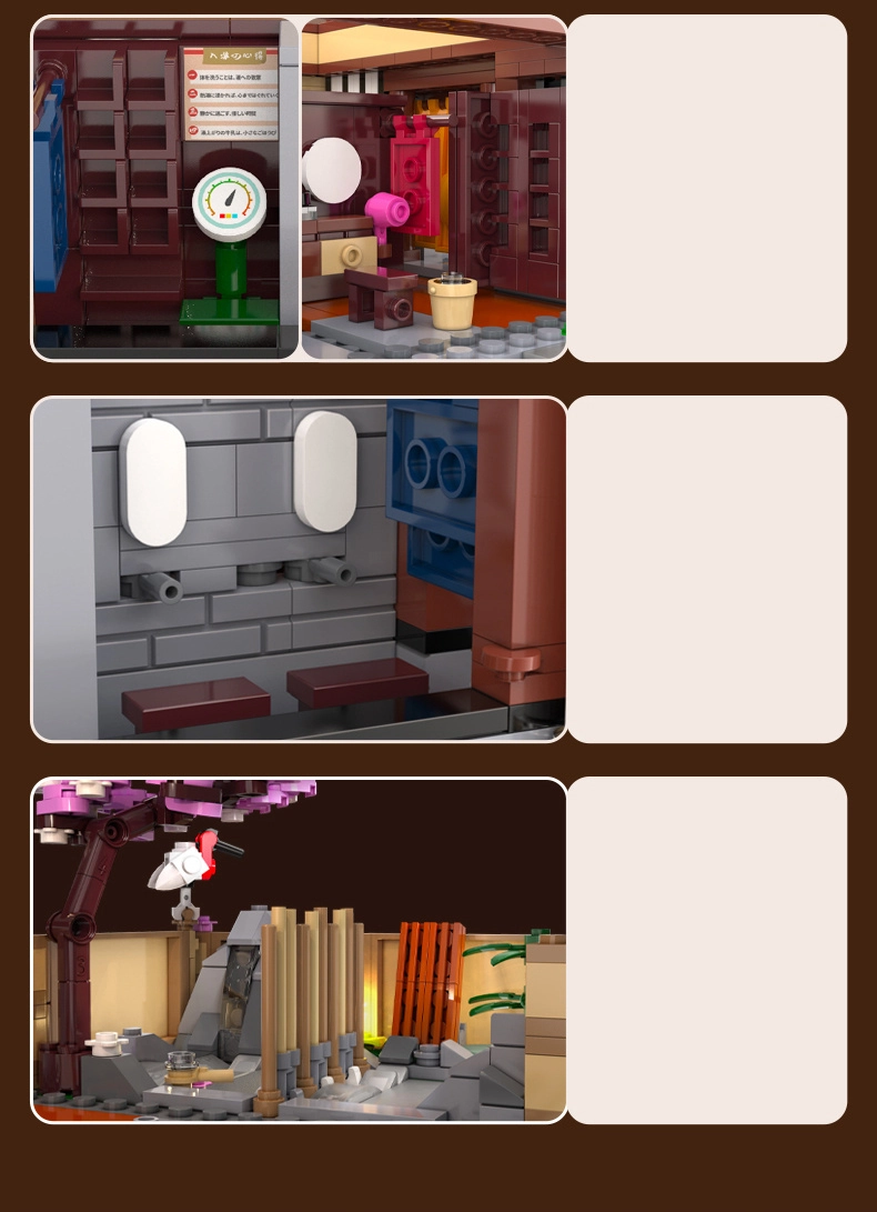 Der Innenraum umfasst eine Rezeption, eine Umkleide und einen Bereich mit heißen Bädern. Bänke, Handtücher und kleine Dekorationen verstärken die Atmosphäre. Die integrierte LED-Beleuchtung mit verschiedenen Effekten verleiht dem Bau Leben und macht ihn zu einer auffälligen Dekoration für jedes Regal oder jede Vitrine.