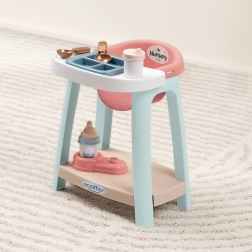 Ein stabiler Hochstuhl mit Tablett ermöglicht es Kindern, die Puppe bequem zu „füttern“ und echte Essensrituale nachzuahmen.