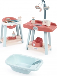 Das Set umfasst eine Wickelfläche mit Staufächern, eine kompakte, hellblaue Badewanne mit Töpfchen sowie einen stabilen Hochstuhl mit abnehmbarem Tablett zum Füttern. Dazu gehören auch Zubehörteile wie eine Flasche, Schüsseln und Besteck, ein Kamm und „Windeln“. Geeignet für Puppen mit einer Größe von etwa 32 cm.