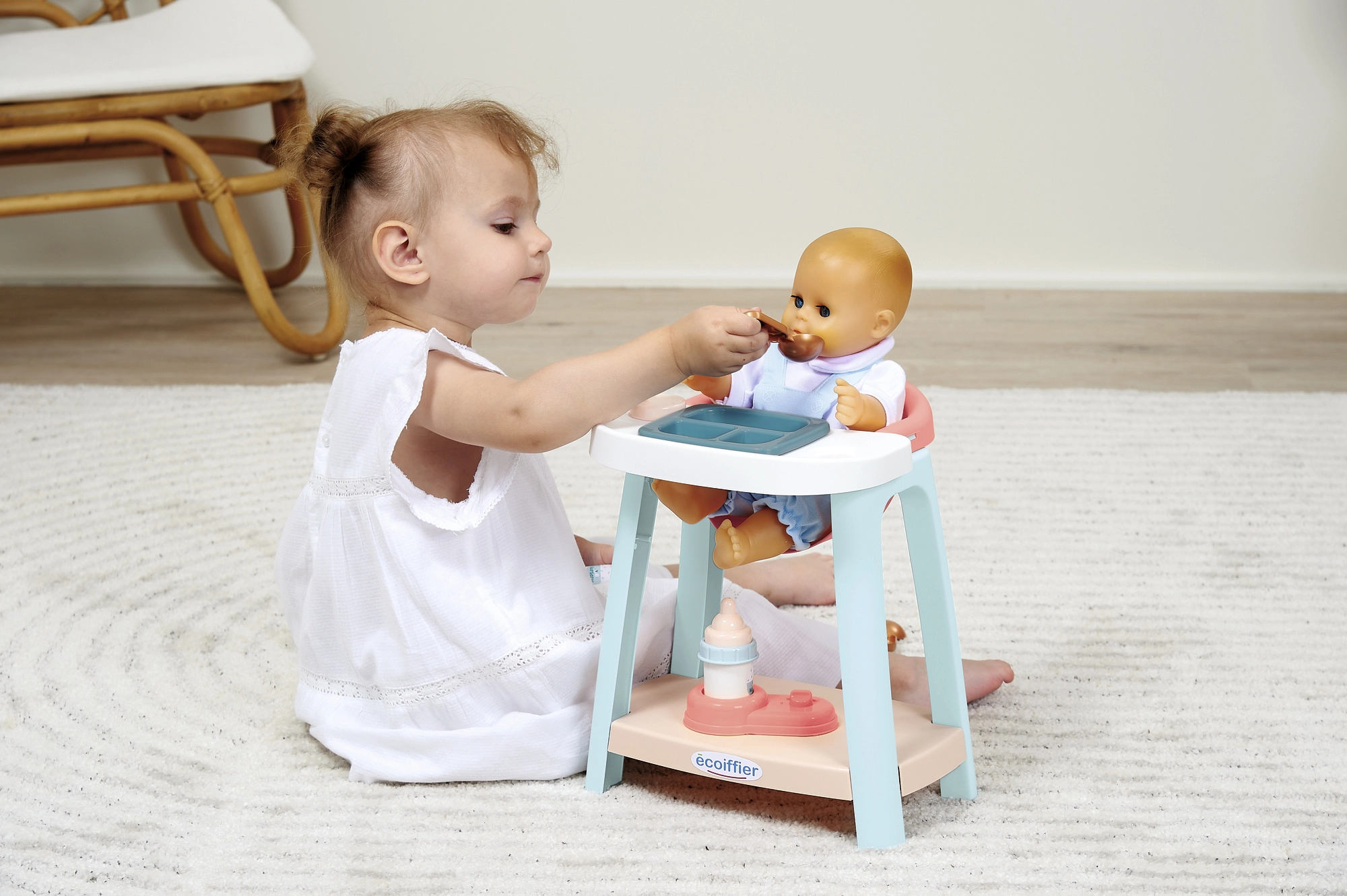 Stabiler Hochstuhl mit unterteiltem Teller, Becher und Besteck ermöglicht Kindern, ihre Puppe realistisch zu „füttern“. Abgerundete Kanten und eine robuste Konstruktion unterstützen sicheres Spielen.