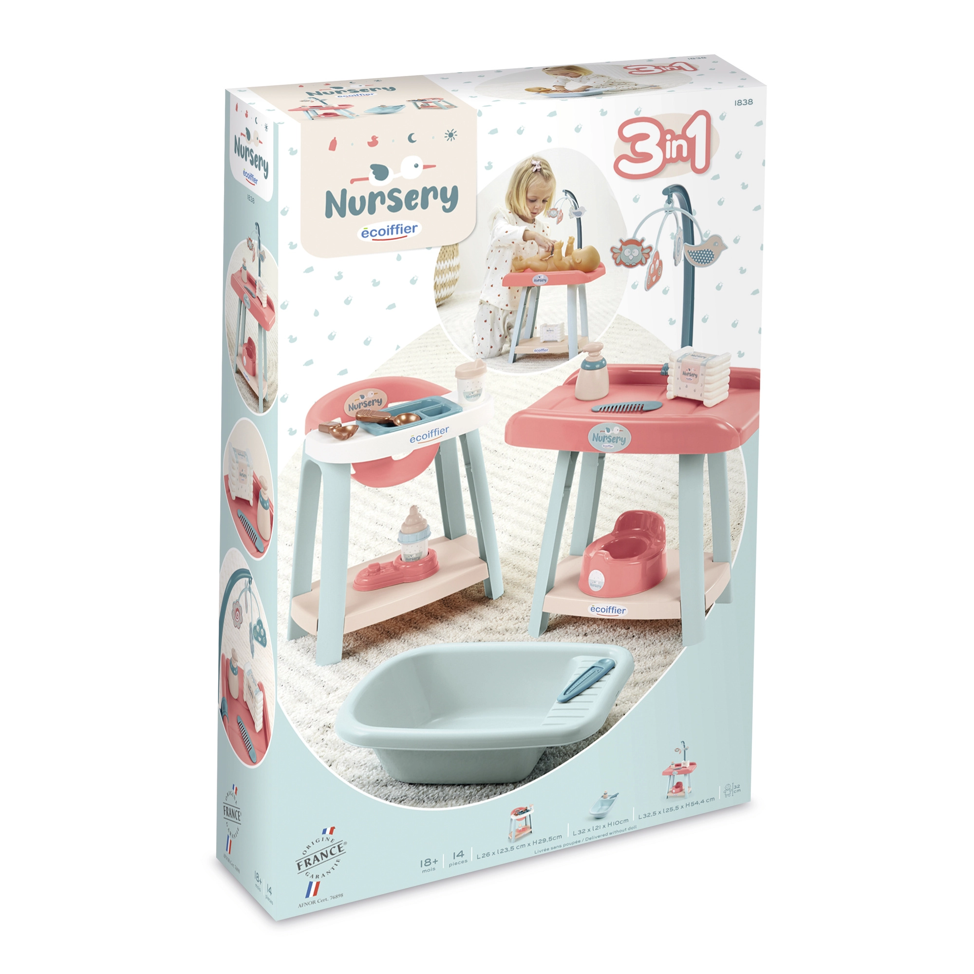 Ecoiffier Nursery 3-in-1 ist ein vielseitiges Set für die Puppenpflege, das alles von Füttern über Wickeln bis hin zum Baden bietet. Dank der drei Spielbereiche und des umfangreichen Zubehörs können Kinder die tägliche Babypflege nachahmen und eigene Geschichten erfinden. Pastellfarben und abgerundete Formen sorgen für eine angenehme Optik und sicheres Handling.