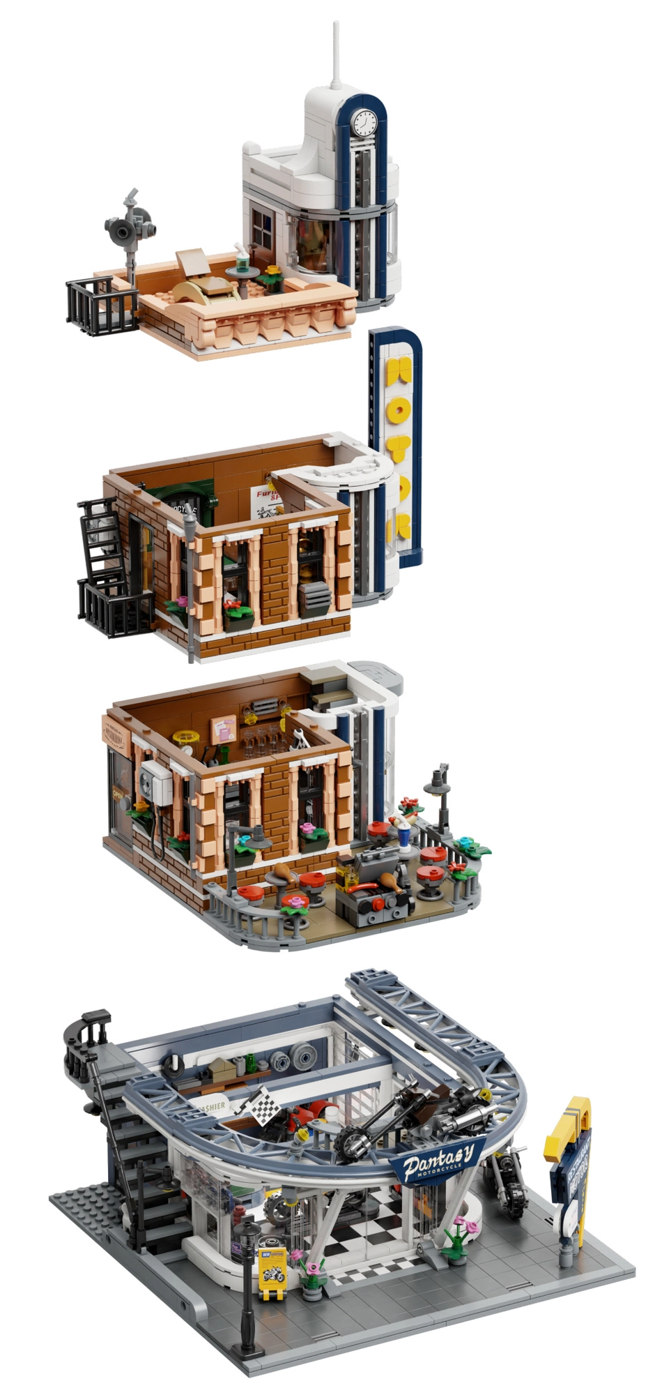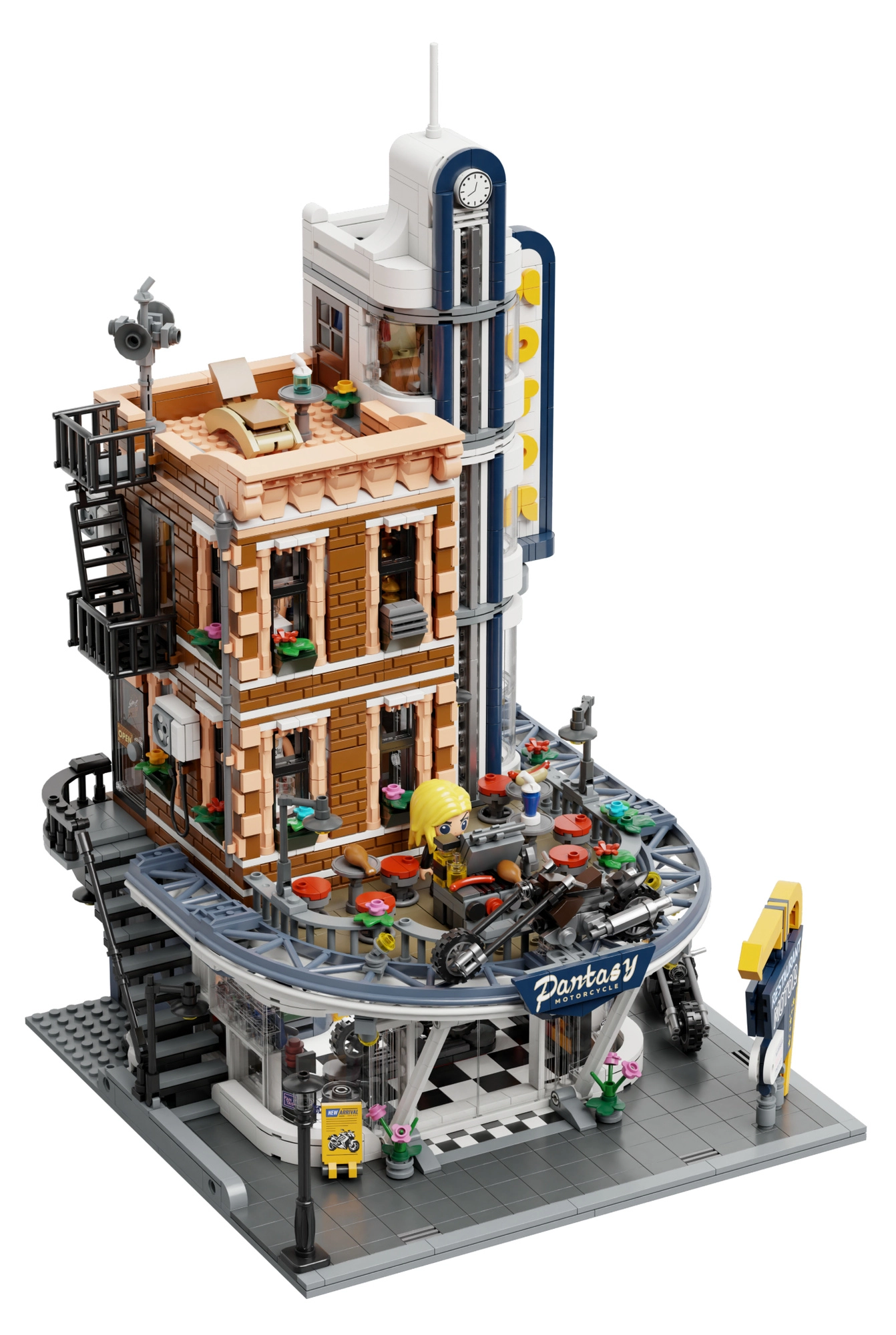 Das Gebäude überzeugt durch präzise Verarbeitung, authentisches Zubehör und zahlreiche Szenen, die die Fantasie anregen. Perfekt für Motorradliebhaber und Sammler von Stadt-Bausätzen.