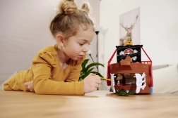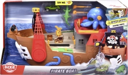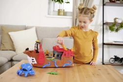 Dieses detailreich gestaltete Piratenschiff ist ein echtes Spaßzentrum. Hebt ihr das Deck an, erscheint eine eingebaute Bahn für das Metallauto, auf der ihr mithilfe von Hebeln und Schaltern bestimmt, ob das Fahrzeug durch das Skeletttor schießt, im Gefängnis landet oder vom Floß katapultiert wird. Mit dabei sind funktionsfähige Kanone, Schatztruhe, Fässer, Krokodil und weiteres Zubehör, das die Fantasie anregt.