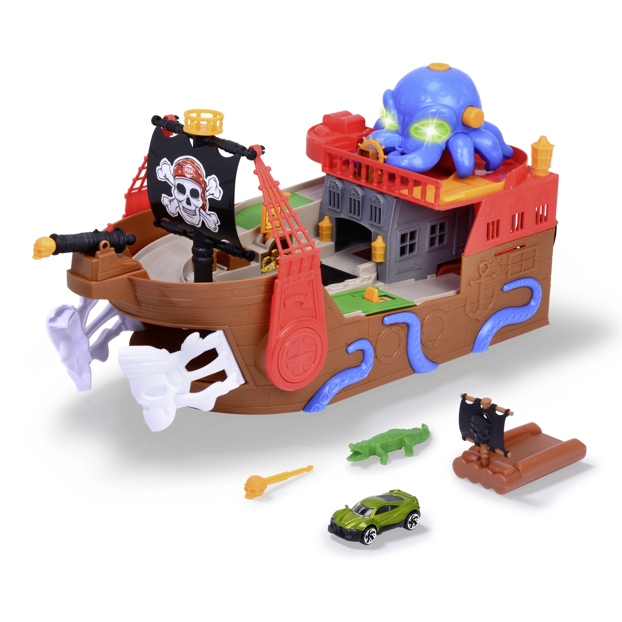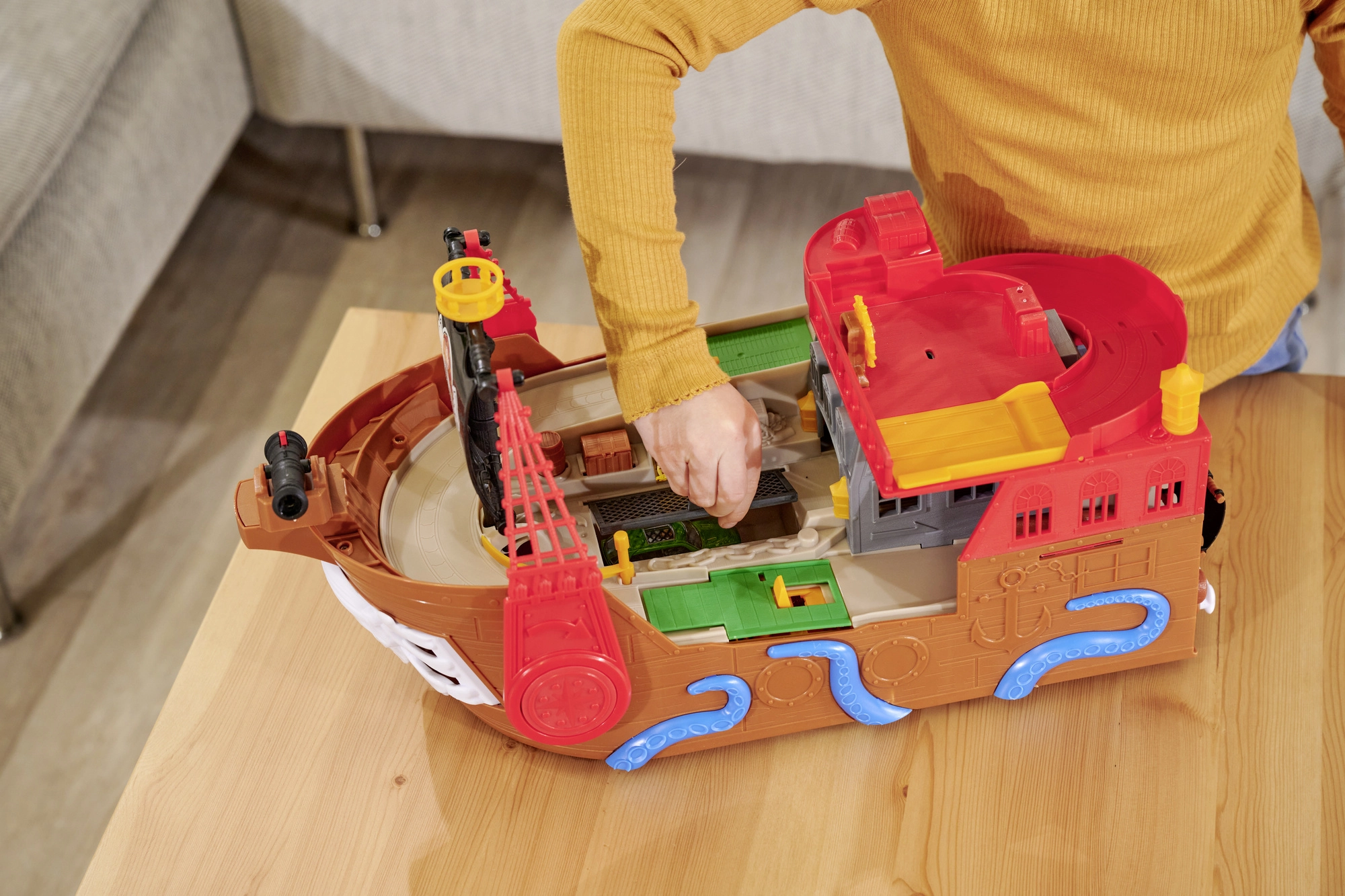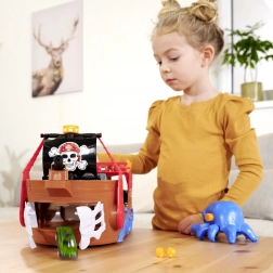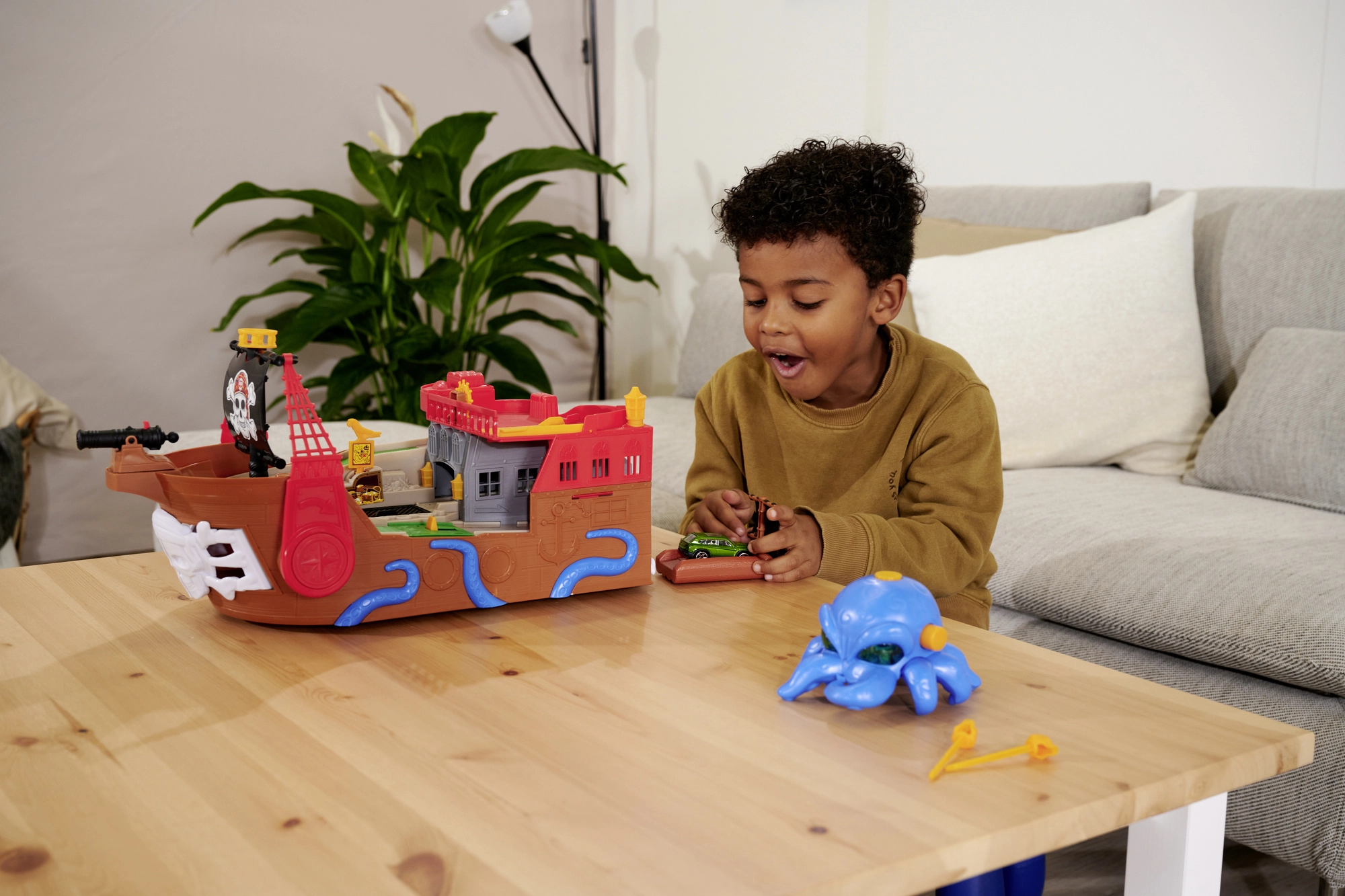 Die abnehmbare Krake mit Licht- und Soundeffekten lässt die Augen leuchten und „schnappt“ sich mit ihren Tentakeln das Auto oder andere Teile – perfekt für dramatische Piratengeschichten. Schiff und Floß bleiben auf dem Wasser, ideal für Badewanne, Pool oder Planschbecken. Nach dem Baden geht die Action dank interaktiver Funktionen und der geschmeidigen Fahrt des Autos auf dem Teppich weiter.